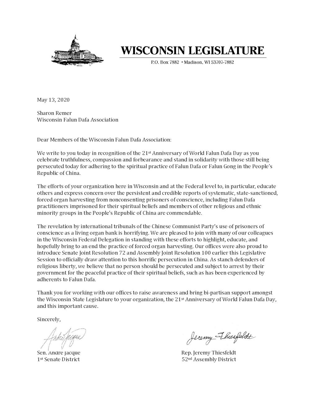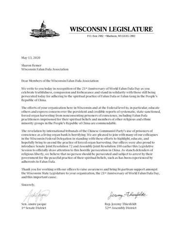 两位议员表示,有持续不断、可信的报告显示,中共从未经同意的良心犯,包括被关押的法轮大法学员身上强摘器官。法轮功学员在威斯康辛州和全美让人们了解这些真相的努力值得赞赏。
