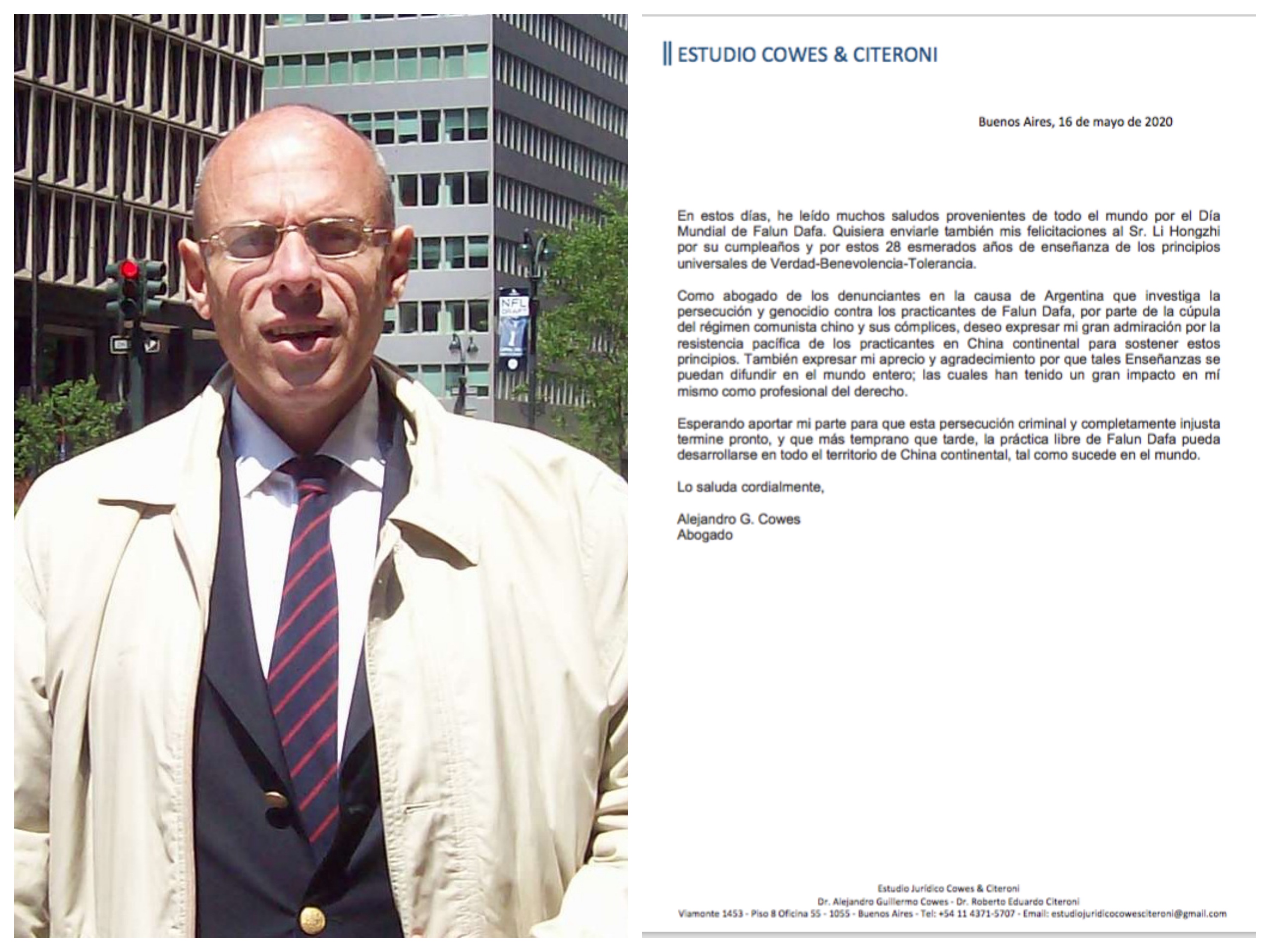 ![]() 图:阿根廷起诉江泽民一案的原告律师亚历杭德罗·考斯(Alejandro G. Cowes)发贺信,恭贺法轮功创始人李洪志先生华诞以及法轮大法洪传世界二十八周年。 |