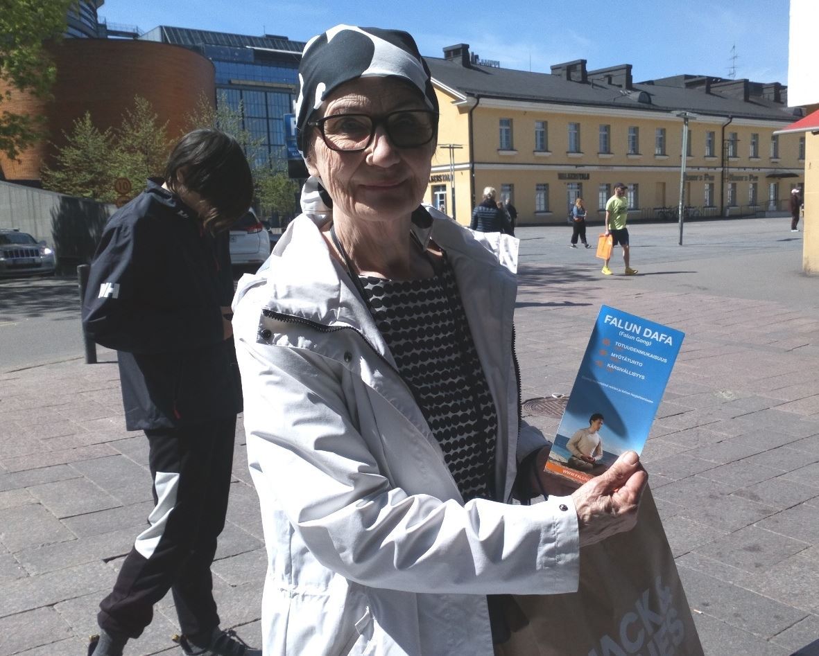 路西(Louhi)是一名大学生,直接到桌子前签名反迫害。她说:“我远远地看了你们很久了。”学员送给她一朵精致的手折莲花。她看着莲花吊坠上的字说:“真善忍是非常好的价值。特别是忍,我很需要。”后来学员跟她谈起中共如何迫害法轮功并活摘法轮功学员的器官。她说:“迫害(法轮功)是绝对不行的。”