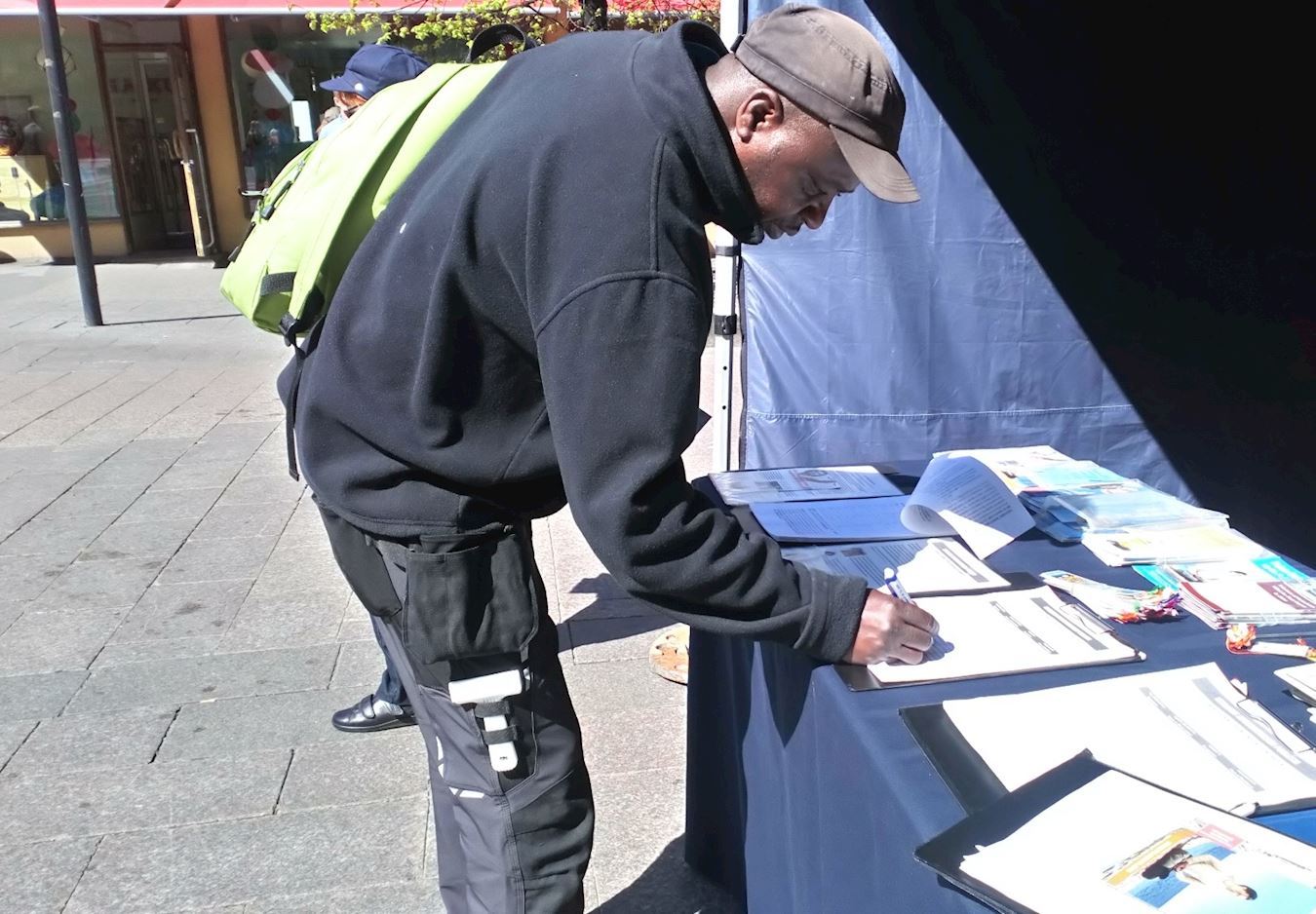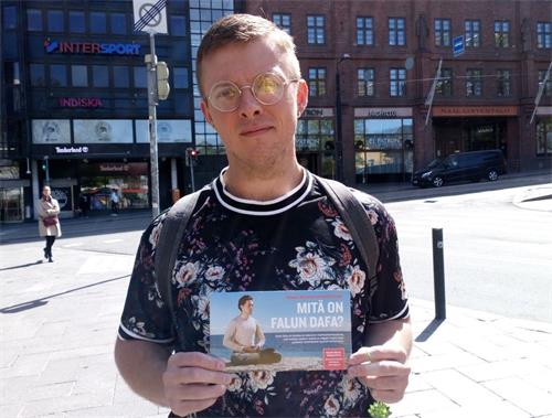 唐札(Tamza)是一位甘比亚人,已移民到芬兰。他看见为人权征签的信息就过来说要签名。学员问:“你知道这是怎么回事吗?”他说:“你告诉我发生了什么事情。”学员就告诉他法轮功在中国被迫害的事情。他说:“我非常了解你们的感受。”最后还问:“我在哪里能找到你们,我要加入你们。”