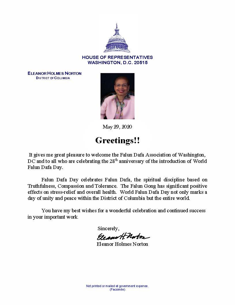 ![]() 图:美国首都华盛顿哥伦比亚特区联邦众议员埃莉诺·霍姆斯·诺顿(Eleanor Holmes Norton)致信祝贺世界法轮大法日及法轮大法传世二十八周年。 |
