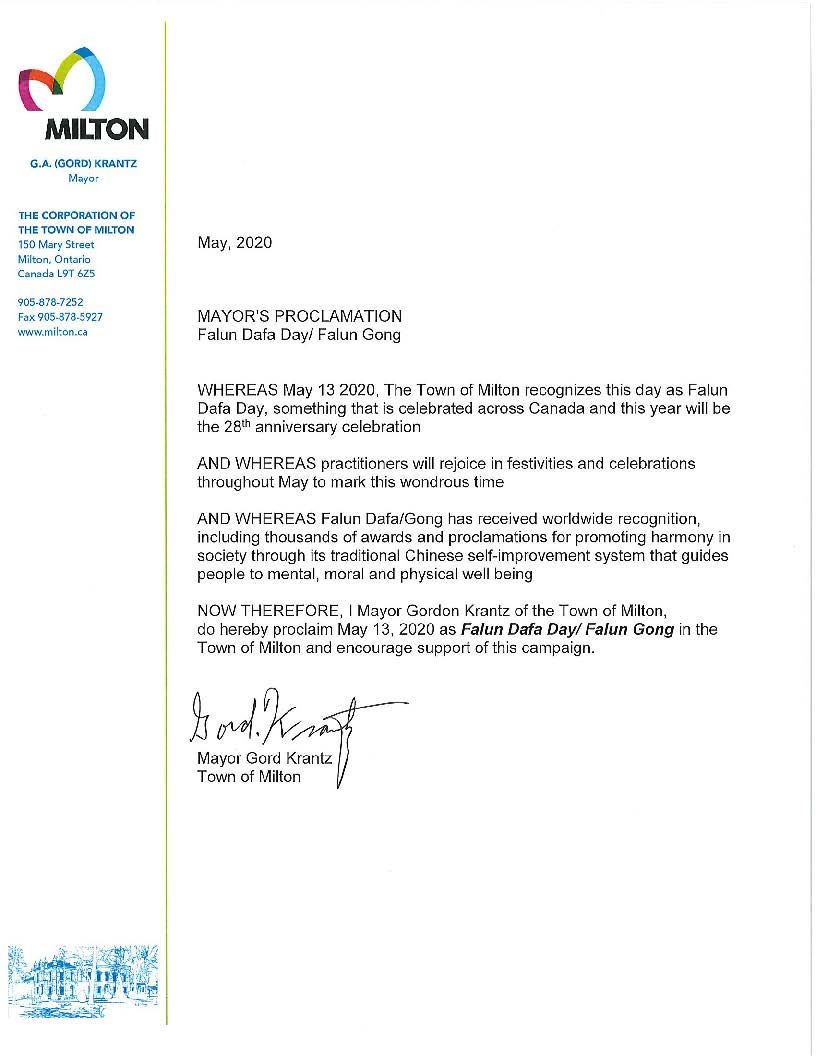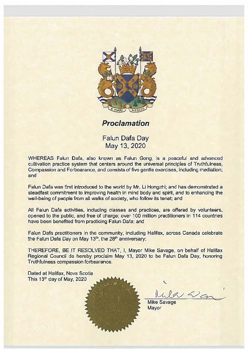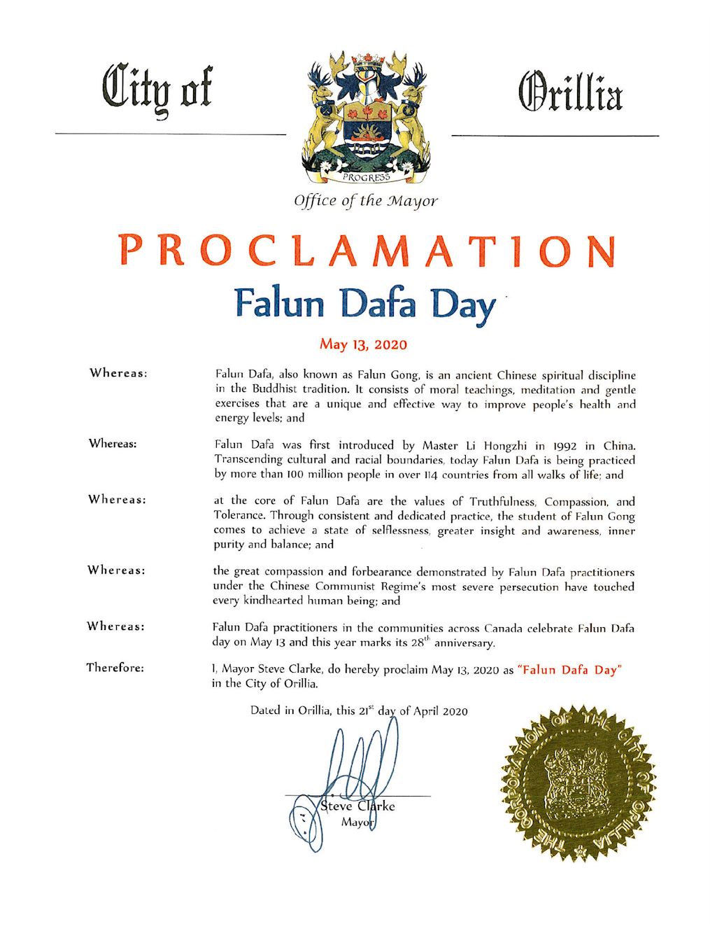 奥里利亚市(Orillia)市长史蒂夫·克拉克(Steve Clarke)宣布二零二零年五月十三日为奥里利亚市法轮大法日。公告中赞扬了创始人李洪志先生介绍于世的法轮大法,提倡真善忍的普世价值,让修炼者法轮大法弟子追求达到无私无我、净化心灵、身心健康的境界;公告中说:“在中共政权最残酷迫害之下,法轮大法弟子展现出的善良和忍耐,感动着每一个善良人的心灵。”