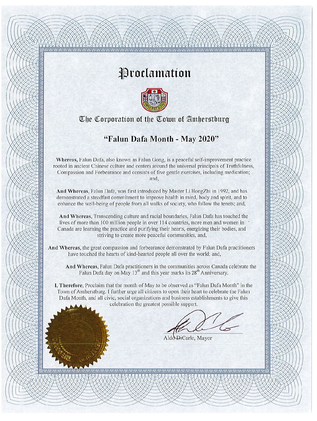 阿默斯特堡市(Amberstbury)市长阿尔多·迪卡洛(Aldo DiCarlo)公布五月为法轮大法月。褒奖信中感谢李洪志大师引导各行各业的修炼人们得到了身心健康、道德提升。 同时,很多加拿大人通过修炼法轮大法,净化心灵、强壮体质、为创建更加和谐的社区而努力。法轮大法修炼者秉承的慈悲和忍让,感动着全世界善良人们的心灵。