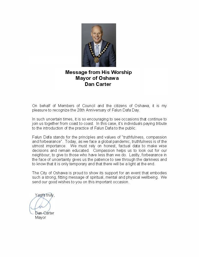 奥沙瓦市长丹·卡特的贺信里说:我代表市议会成员和奥沙瓦市民,很荣幸地宣布第28个“法轮大法日”。