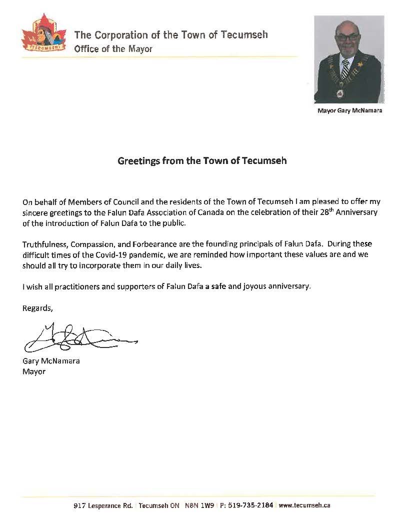 特库姆塞(Tecumseh)市的市长加里·麦克纳马拉的贺信写道:我荣幸地代表市议会成员和Tecumseh镇的居民,向加拿大法轮大法协会致以诚挚的问候,庆祝法轮大法向公众传出28周年。真,善、忍是法轮大法创始的宗旨。在COVID-19大流行的困难时期,我们要铭记这些重要价值观,并且在日常生活中遵守。我祝福法轮大法的所有修炼者和支持者度过一个平安和快乐的周年纪念。