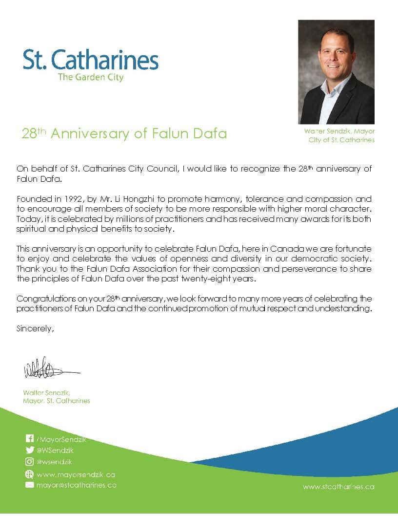 圣凯瑟琳市(St. Catharines)市长沃尔特·森吉克(Walter Sendzik)的贺信写道:这个周年纪念活动是庆祝法轮大法弘传于世的良机。在加拿大我们很幸运可以举行法轮大法庆典活动,可以在这个自由民主的社会分享开放的价值观和文化的多元性。感谢法轮大法协会28年来热忱善良、坚持不懈地与民众分享法轮大法的普世价值。