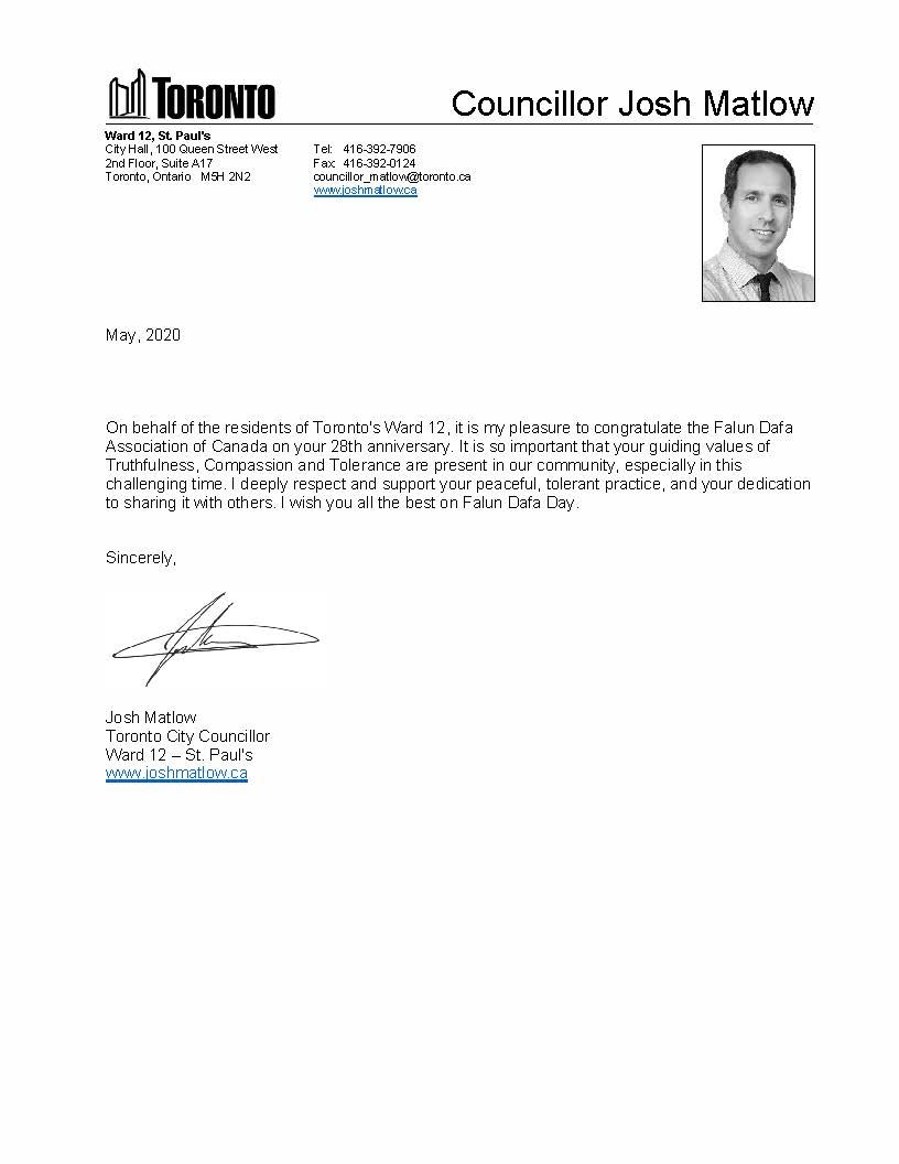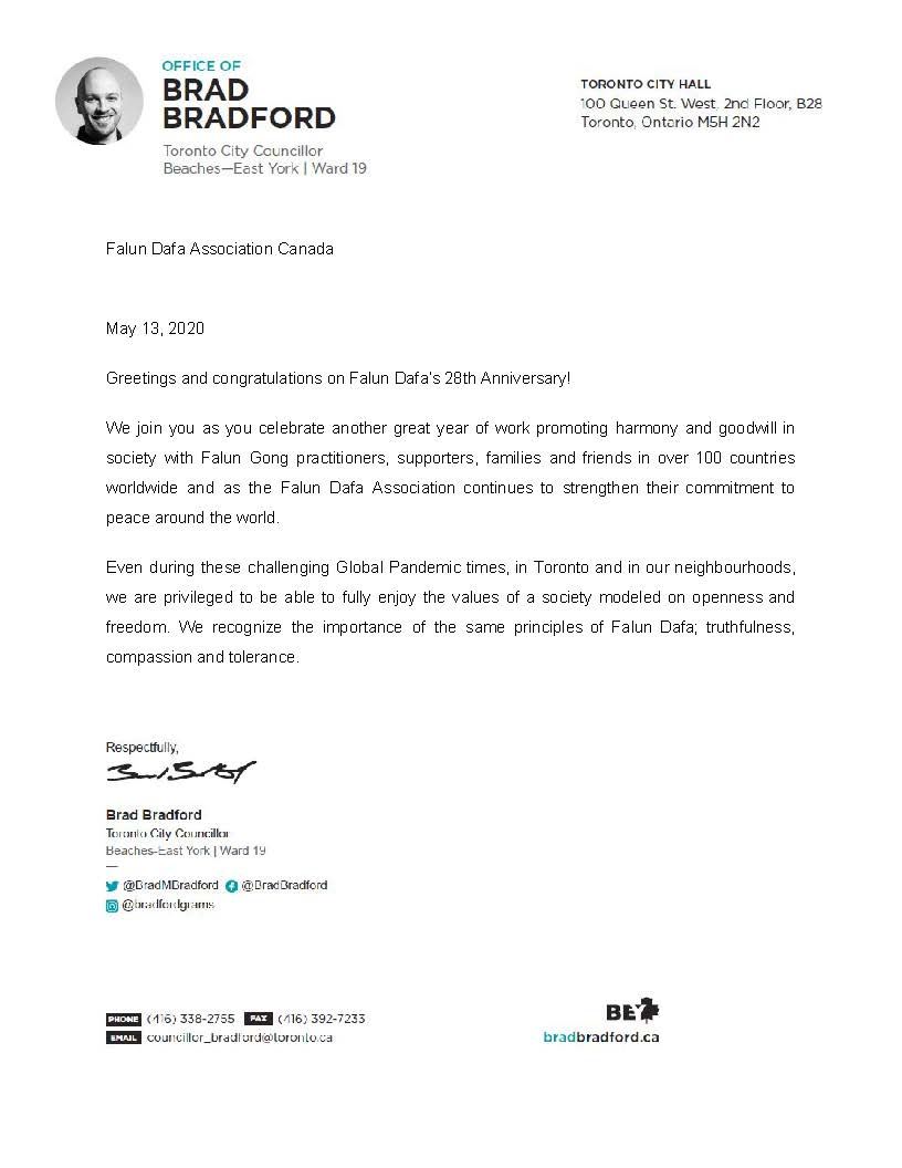 多伦多市议员布拉德·布拉德福德(Brad Bradford )来信致加拿大法轮大法协会。信中说:热烈祝贺法轮大法28周年纪念日。让我们与100 多个国家的法轮功学员,支持者,家人和朋友一起庆祝过去一年辛勤工作的伟大成就,让我们为促进社会和谐、邻里和睦继续努力!祝愿法轮大法协会在来年继续致力于世界和平的神圣事业。