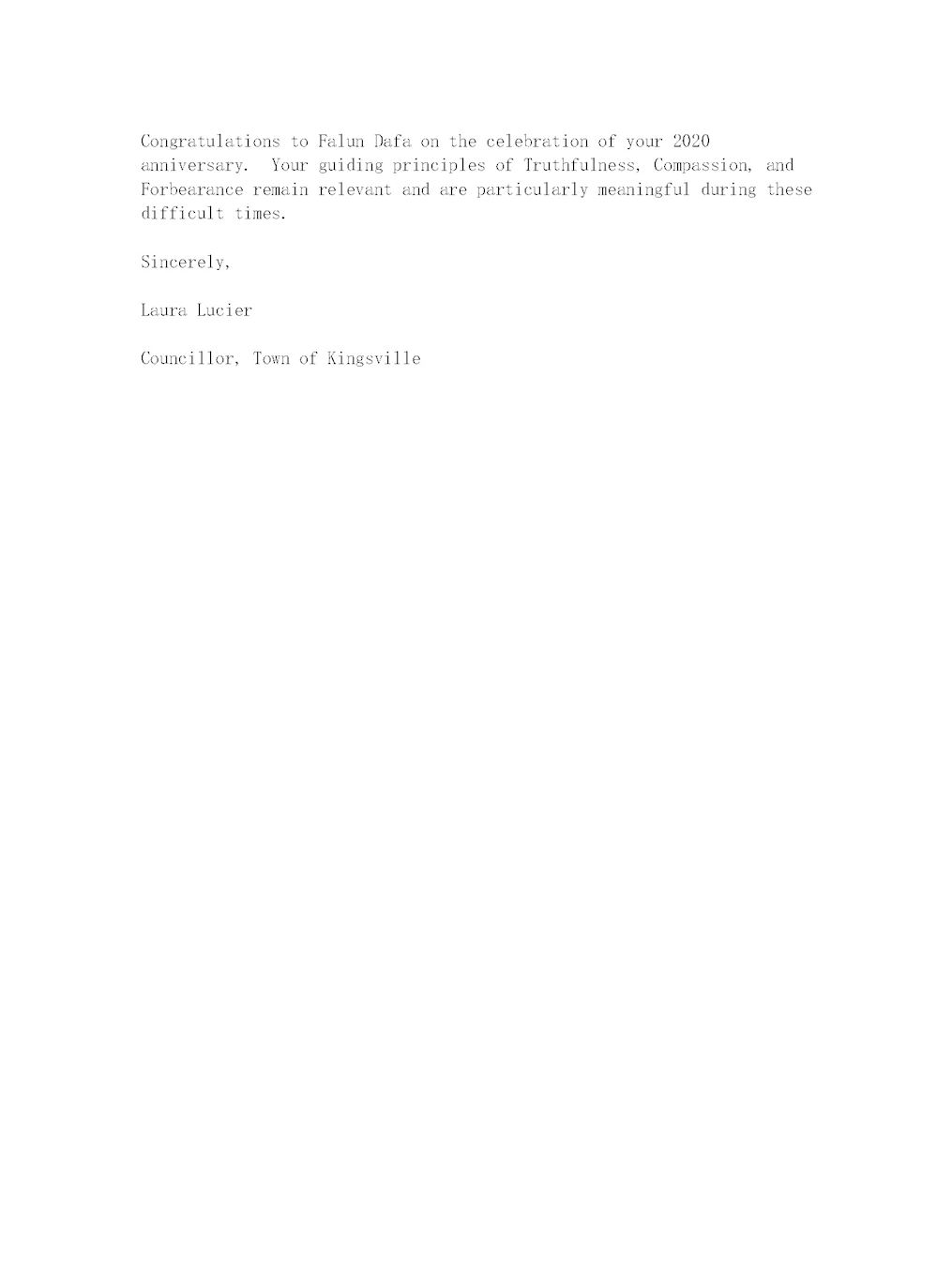 金斯维尔镇市议员(Town of Kingsville)劳拉·露西尔 (Councillor - Laura Lucier)在来信中说:“恭贺法轮大法2020法轮大法日。你们真善忍的指导理念在当前的这个艰难时刻显得尤为意义深刻。”