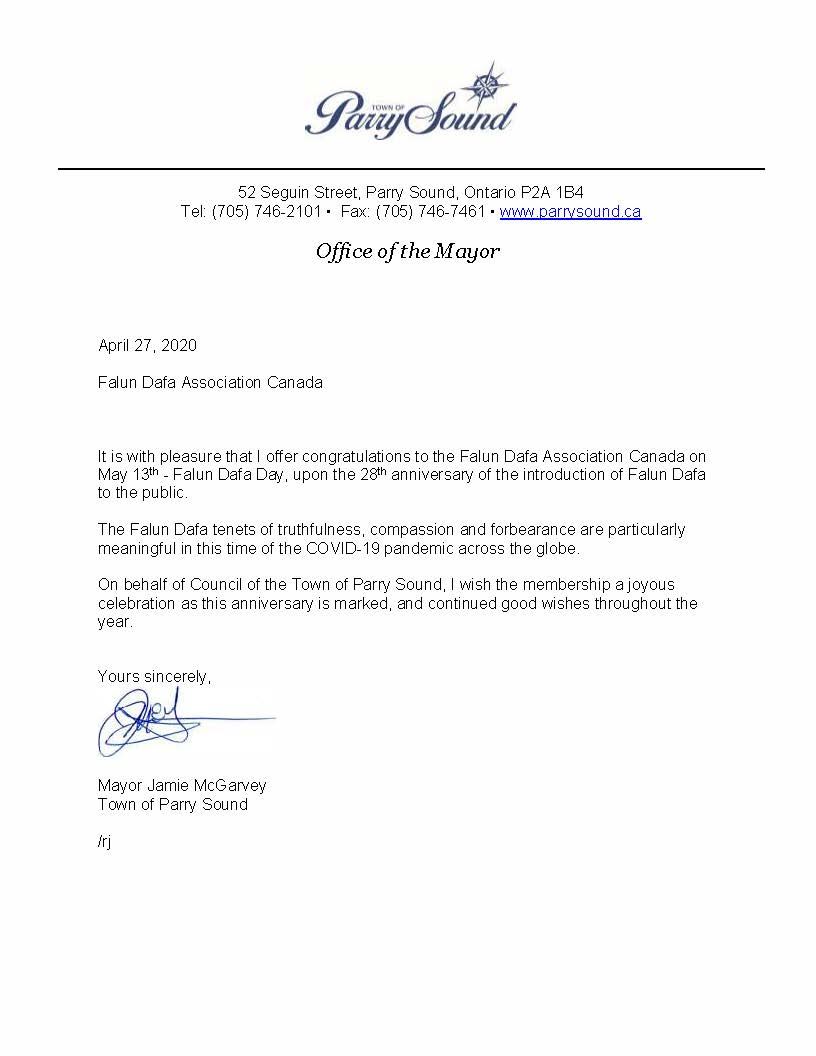 帕里桑德(Parry Sound)市市长杰米·麦加维(Jamie McGarvey)致加拿大法轮大法协会的贺信中说:在法轮大法弘传于世28周年庆贺之际,我非常荣幸地向加拿大法轮大法协会送上我衷心地祝贺,共同庆祝5.13法轮大法日!
