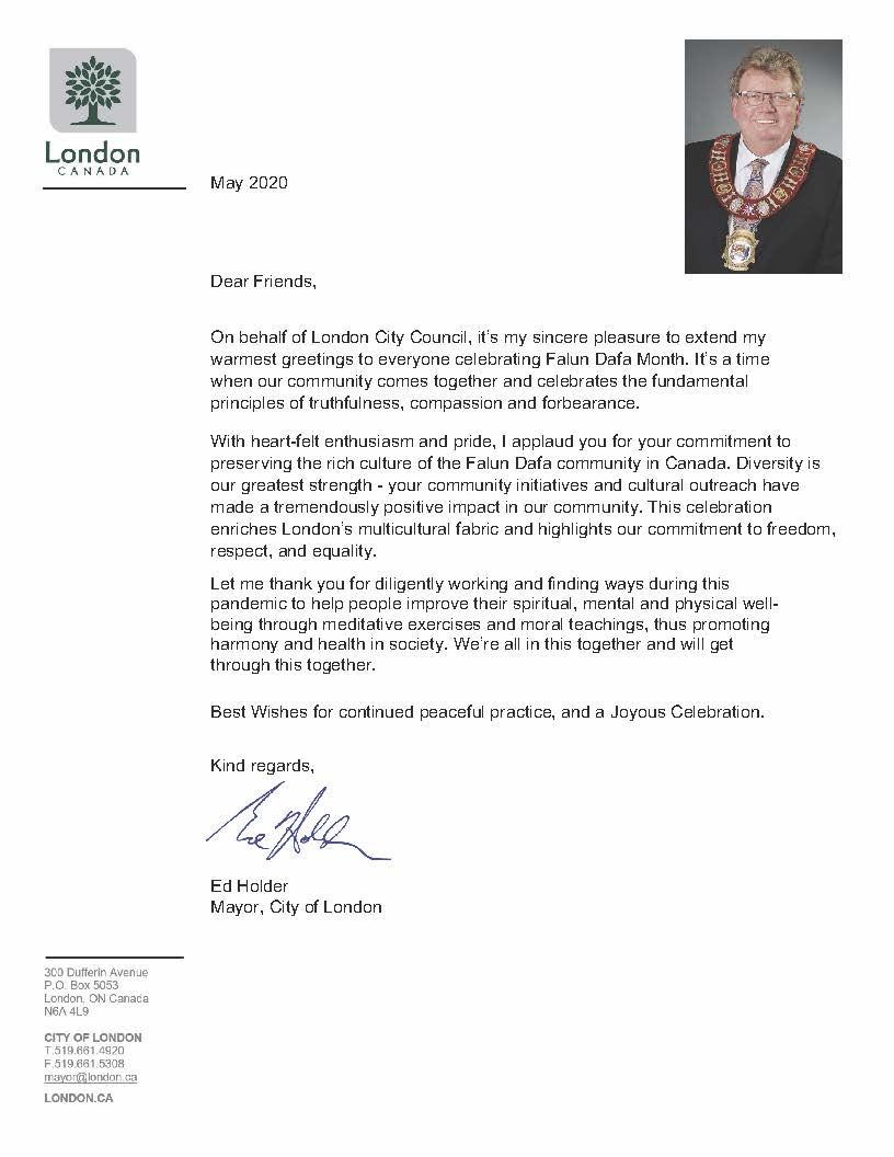 心怀由衷的热情与自豪,我为你们在加拿大保护及传承法轮大法的丰富文化而喝彩。多元是我们最大的优势。你们的社区活动与文化推广对我们的社区产生了巨大的正面影响。这次庆祝活动丰富了伦敦市的多元文化,并凸显了我们对自由、尊重、平等的弘扬。