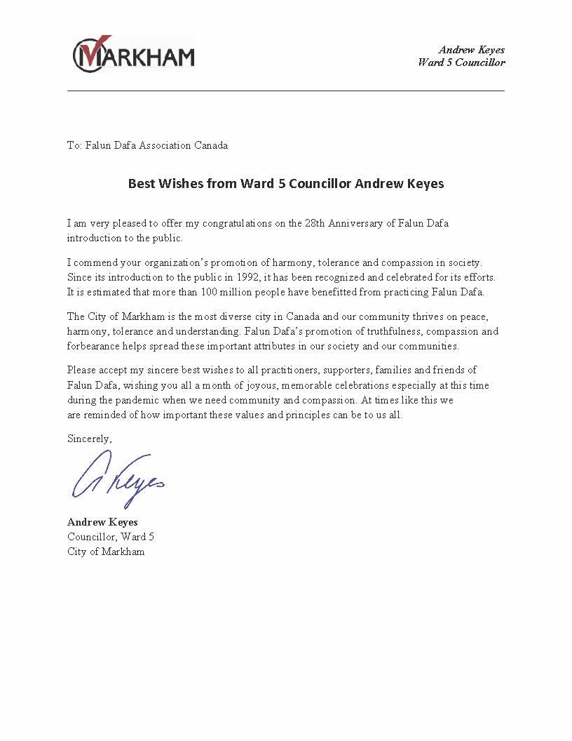 来自万锦市议员安德鲁·凯斯(Andrew Keyes)写给加拿大法轮大法协会的贺信中,他说:“我赞赏你们在社会中对平和、忍让和善良的推广。”他还表示:法轮大法对“真、善、忍” 的弘扬有助于这些价值观在我们的社区中传播。请接受我诚挚的、最美好的祝愿,法轮大法修炼者、支持者、家人和朋友,祝你们这个月的庆祝活动愉快而有意义,特别在这个我们都需要社区支持与彼此关心的大瘟疫期间。在这样的日子里,我们要特别铭记,这些价值和准则对我们每个人有多么重要。