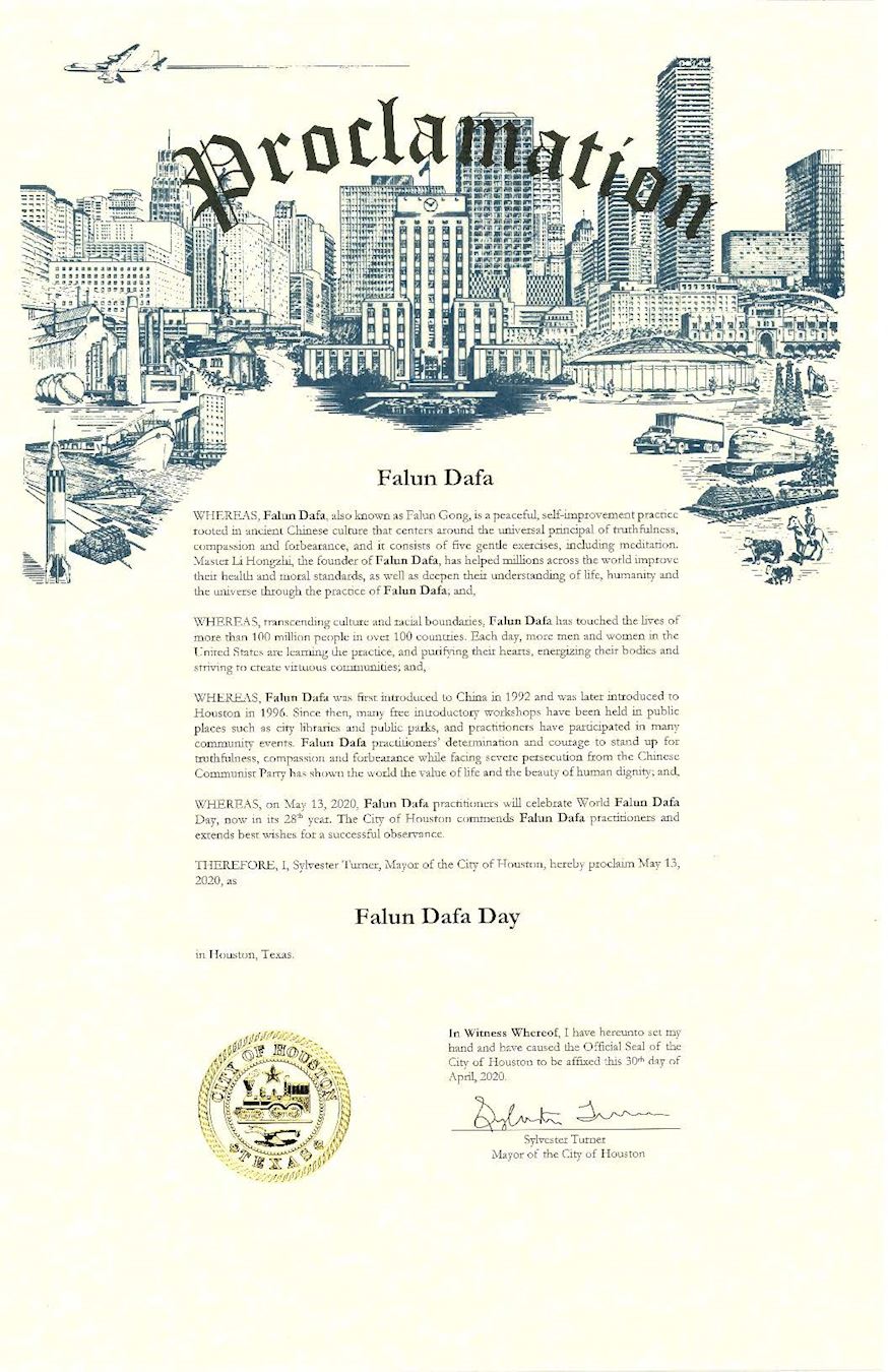 因此,我,西尔威斯特·杜南(Sylvester Turner),作为休士顿市长,特此宣布二零二零年五月十三日,为“法轮大法日” 。