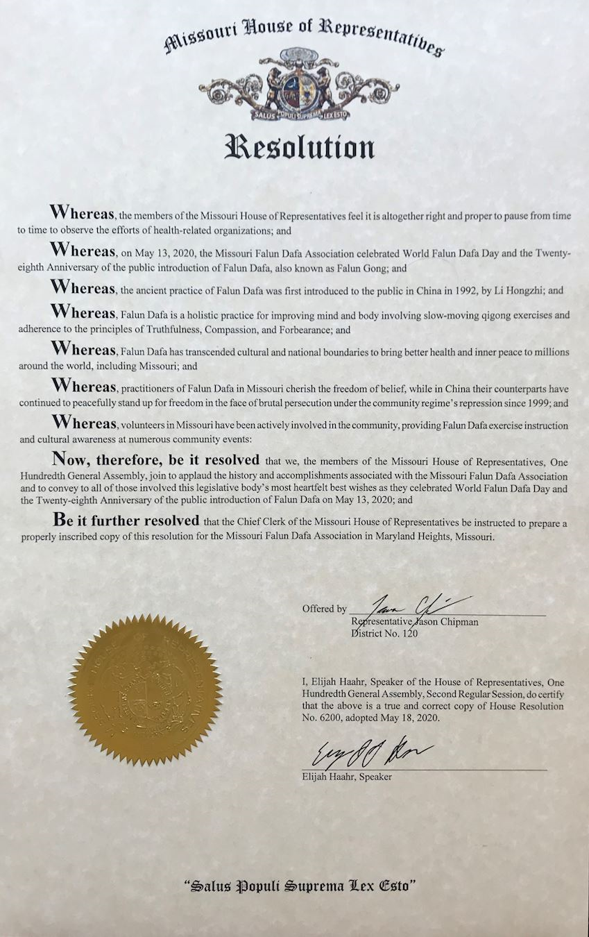 鉴此,我们,密苏里州众议院第一百届议会的议员们,向密苏里州法轮大法学会在过去取得的成就表示祝贺。请接受来自此届议会所有人员对世界法轮大法日和法轮大法弘传二十八周年最衷心的祝福。
