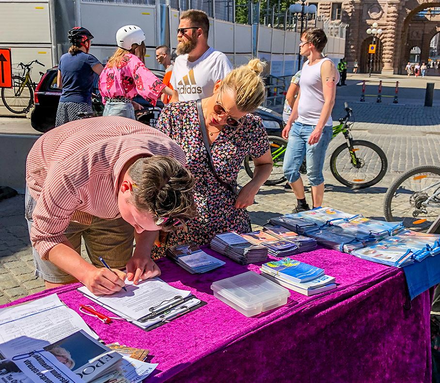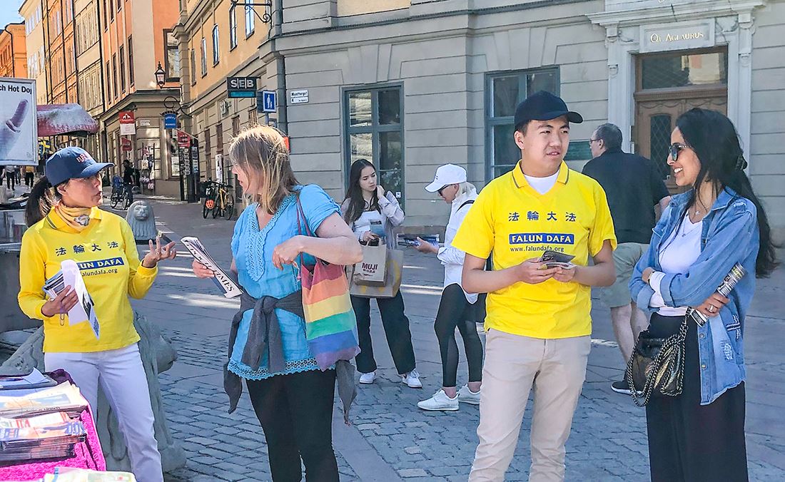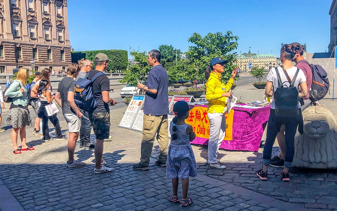 中共病毒疫情爆发后,随遇而安的瑞典人采取了不封城、不隔离,独特的抗疫方式。人们大多都减少了外出、自觉遵从政府指定的防疫具体措施。夏天是瑞典一年中最美好的季节,珍爱生命、热爱生活的瑞典人很会把握大自然的节拍,在这美好的夏日里人们是难以接受不能在草地上晒太阳、外出享受阳光的。活动当天,钱币广场上过往的人流明显的多了起来,人们三五成群的逛街、散步,尽情享受着这大自然的美好。在法轮功学员的活动场地前有很多人停下脚步、拍照,有人在静静观看学员炼功、有人在观看真相展板,了解真相后,有的人主动走过来签名支持法轮功学员反迫害并和学员交谈,了解更多的详情。