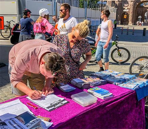 当天来听法轮功学员讲真相的还有很多二十多岁瑞典的年轻人,他们得知自己在自由民主国家长大成人的这段时期,中共竟然用如此残暴卑鄙的手段迫害修炼“真、善、忍”的善良民众,而且这场迫害已经持续了二十多年了,很是震惊、气愤。了解了真相后,他们都主动签名,以此来表达自己制止迫害、支持正义的心愿。