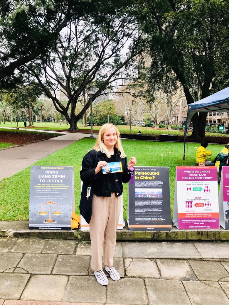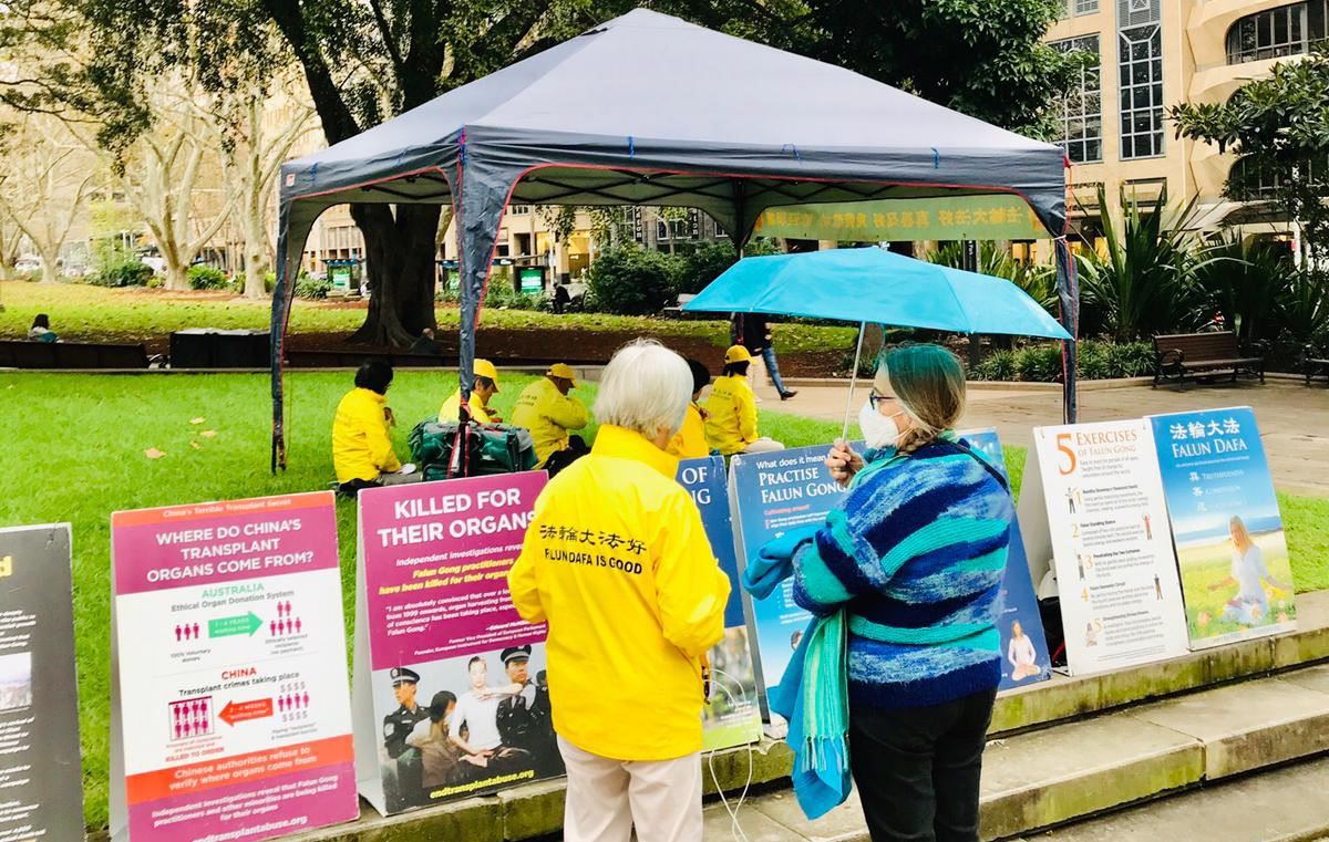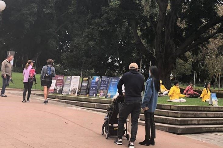 二零二零年五月二十二日起,悉尼部份法轮功学员如往常一样,在海德公园的入口处摆放了介绍法轮大法五套功法、中共迫害法轮功及活摘法轮功学员器官等真相展板,随着优美的炼功音乐展示着法轮大法缓、慢、圆的五套功法。自六月五日起规定可以派发真相资料起,民众主动接资料的比瘟疫爆发前明显多了,过路民众有驻足观看展板的;有观看功法演示的;还有主动和法轮功学员交流了解真相的。明白真相后的他们赞扬法轮功学员了不起,有的认为如果人人都遵循“真、善、忍”的原则,世界将会非常和平;有的认为按“真、善、忍”做好人、提升自己的道德修养很好;有的认为能在是非面前分清善恶,不为中共站台可免受中共病毒感染而感到高兴。他们呼吁制止中共迫害法轮功,全世界人民联合起来一起消灭中共。