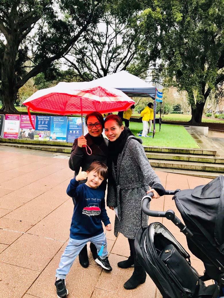 当地居民越裔钱特尔(Chantel)女士带着她可爱的儿子和她的朋友一起散步,看到正在炼功的法轮功学员,她停下脚步对正在派发资料的法轮功学员说:“我真的很喜欢打坐,我真的很想学炼法轮功,因为我的母亲正在越南学炼法轮功。她觉的法轮功很好,所以打电话给我,要我学炼法轮功。”