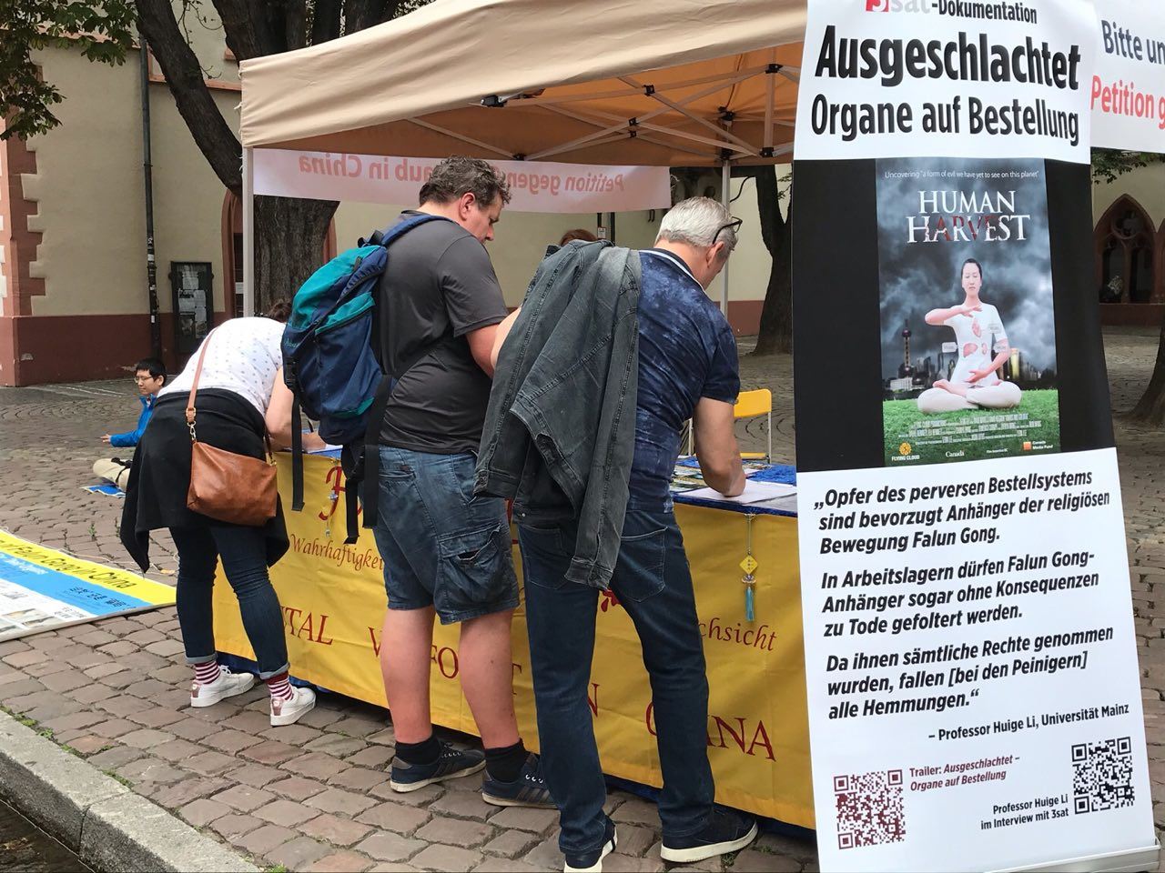 弗赖堡(Freiburg)位于德国西南端黑森林边缘,靠近瑞士,与法国相邻。法轮功学员的信息日设在市政厅广场(Rathausplatz)上,德国民众看到有关中共活体摘取法轮功学员器官的真相后,纷纷到信息台签名,声援法轮功学员反迫害。