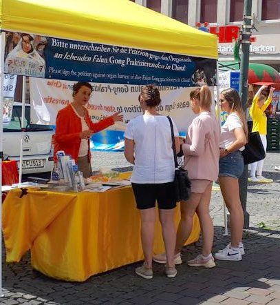一位德国中年女士来到信息台,在反对中共活摘器官的签名表上签字,她表示自己知道法轮功,并在家里炼了八年。她对“能量”感兴趣,学习和研究过很多与之有关的书籍,她认为法轮功是其中最好的,所以就自己在家炼,并在自己的朋友圈中推广。学员告诉了她本地炼功点的信息,并告诉她大家一起炼功能量场会更强,如果动作不准确还可以互相纠正。