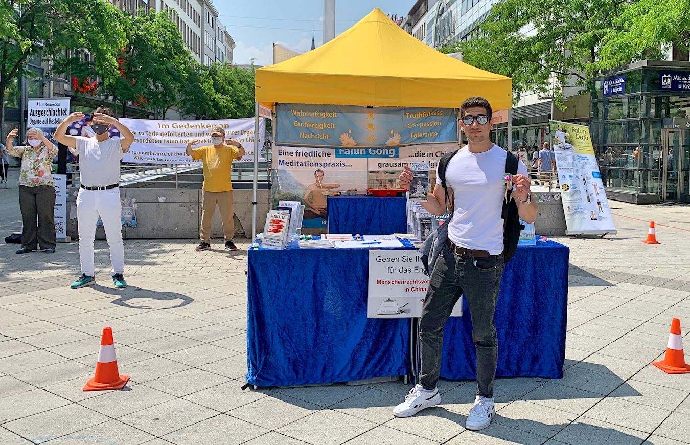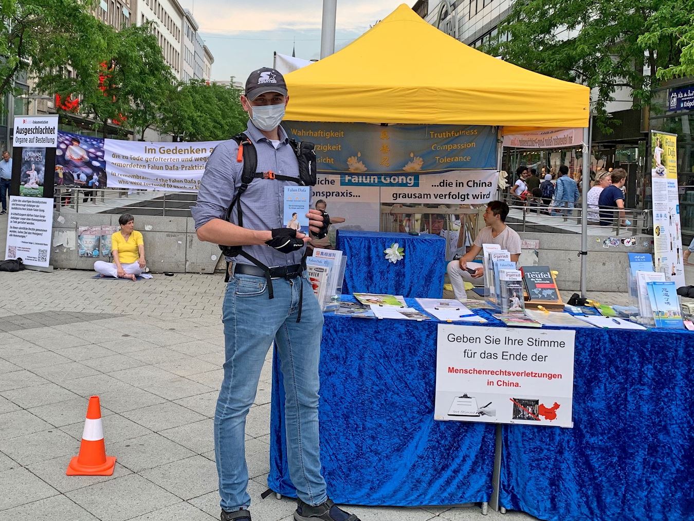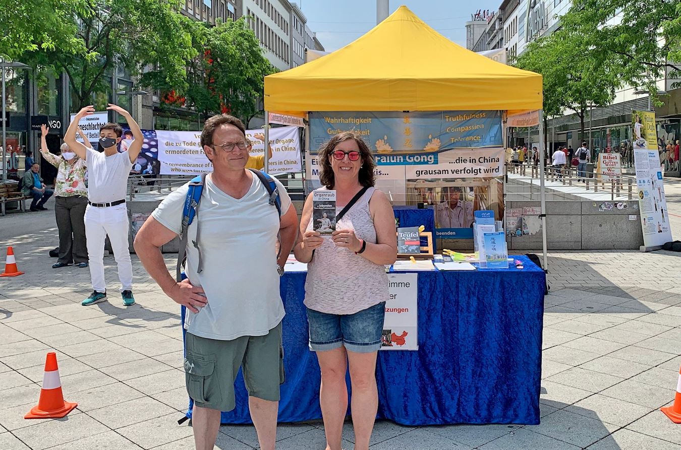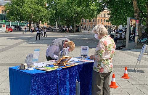 一为退休前曾为护士的女士来到展位前、在征签板上签名。她表示看到发生这样的事情(中共活摘法轮功学员器官)让她感到很难过。她之前也有听说过这场(在中国发生的对法轮功学员的)迫害,她阅读过许多相关的内容。她说:“这是在犯罪,这违反了人权。”她希望这场迫害可以尽快结束。离开之前她对学员说:“我祝愿您一切都好。”