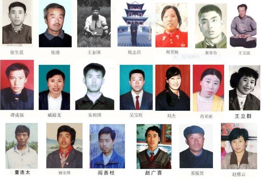 王金国、朱相国、谭成强、蒋立国、杨继芝、王德丰、李亚茹、庞思媛、王文波、佟文成、王秀兰、刘清久、赵广喜、那常俭、高广恩、韩文凤、闫善柱、伊福全、柳全国、金纯清、王文兰、岳宝学、夏元波、董连太、董桂兰。其中,岳宝学、闫善柱、金纯清、柳全国、伊福权等5人疑为在非法关押期间被强行注射了不明药物,回家后药性发作致死。