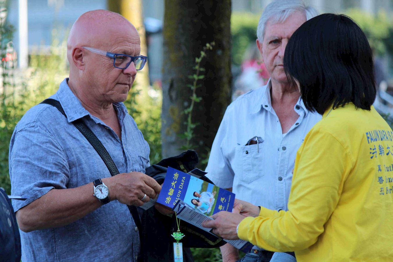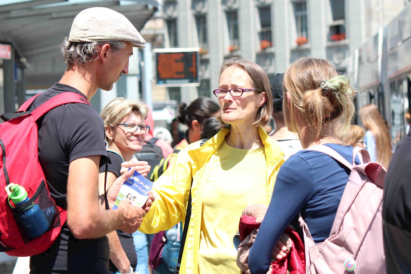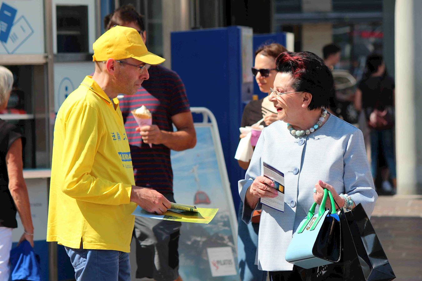 一直以来,法轮功学员都会定期在旅游胜地卢塞恩举办信息日活动,不仅向来此观光的中国游客展示法轮功的美好,也让当地的民众更多的了解在中国发生的对法轮功学员的血腥迫害。当迈耶女士(Beate Meier)再次看到法轮功学员的信息摊位后,她当即签名,并谈道:“两年前我听说了(中共)对法轮功的迫害,(这场迫害)持续太久了……那是两年前的一个阳光明媚的日子,我巧遇(信息日活动),有人(法轮功学员)向我讲解中共迫害法轮功的真相。我当时是如此的惊讶,目瞪口呆,居然会有(中共活摘器官)这样的事情发生,我们的媒体可不常报道这样的讯息,我当即决定签名支持(法轮功学员)。”从此她每年都会签名支持法轮功学员。