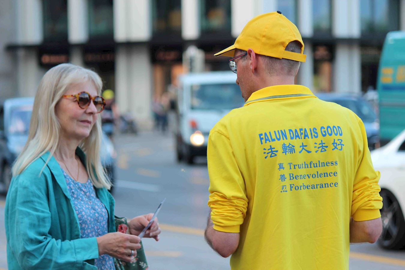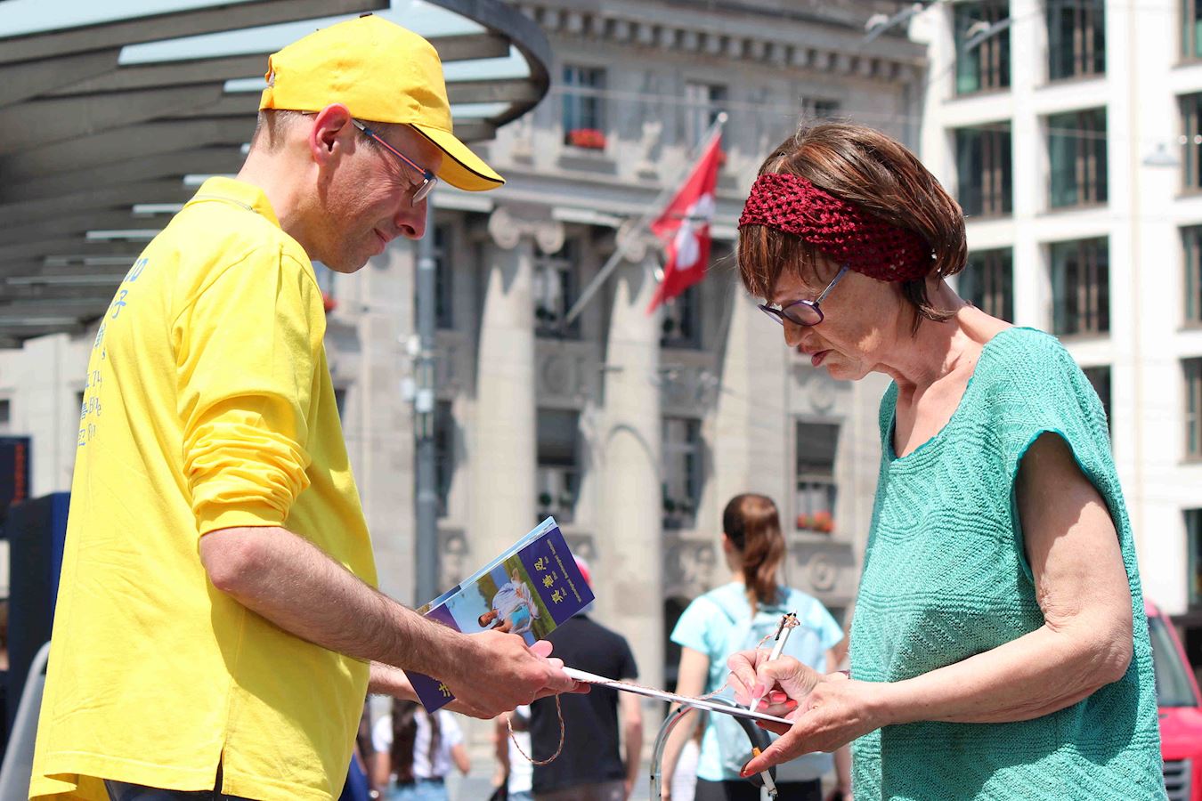 葛根夏次女士(Monika Gegenschatz)退休前曾是一位企业家,她也曾在卢塞恩以往的信息日活动上了解到法轮功学员被迫害很久了,并一直都签名支持法轮功。当再次遇到法轮功学员后,她很想了解法轮功的近况,和学员谈了很久,临行前她再次签名要求瑞士联邦政府采取措施制止中共活摘器官的罪行。