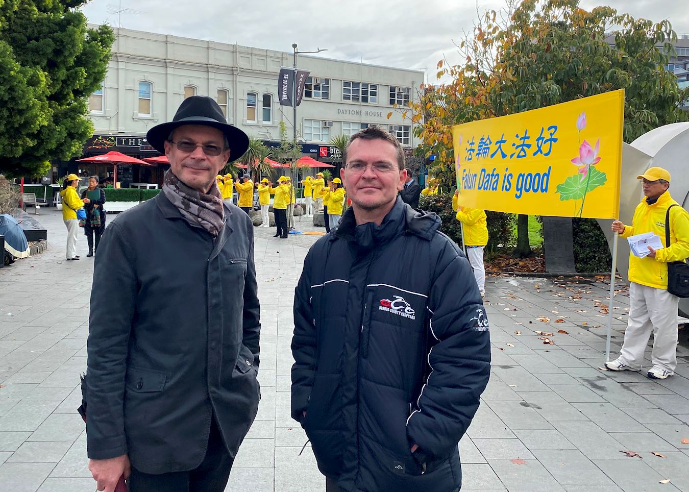 新西兰一家网站的管理人员马克(Michael)在活动结束后,主动来找主持人朱迪(Judy)和艾伦(Alan)聊天,他表示十分赞同法轮功学员的观点,尤其“中共病毒(CCP virus)”这个称呼非常准确。他说,他还了解中共活摘法轮功学员器官的事件,对持续了这么多年的这场迫害,他感到非常难过。他感叹道,法轮功学员们做着一件非常伟大的事。他认为中共不代表中国,它们甚至痛恨中国人的传统信仰。他支持法轮功学员。希望以后能有机会合作和提供帮助。
