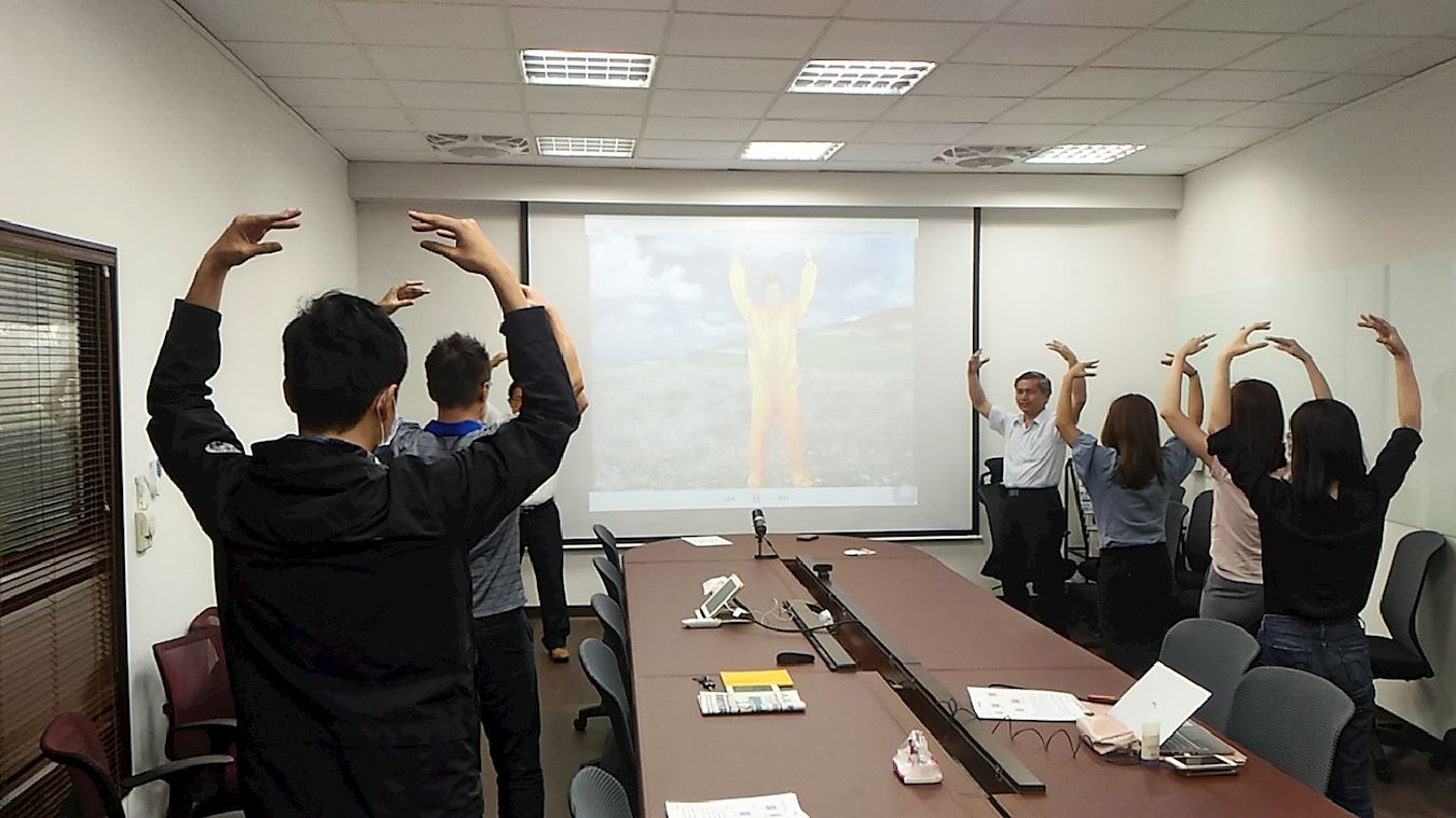 ![]() 图1:在公司会议室里举办的法轮功九天学法班,新学员们跟着教功录像带炼功。 |