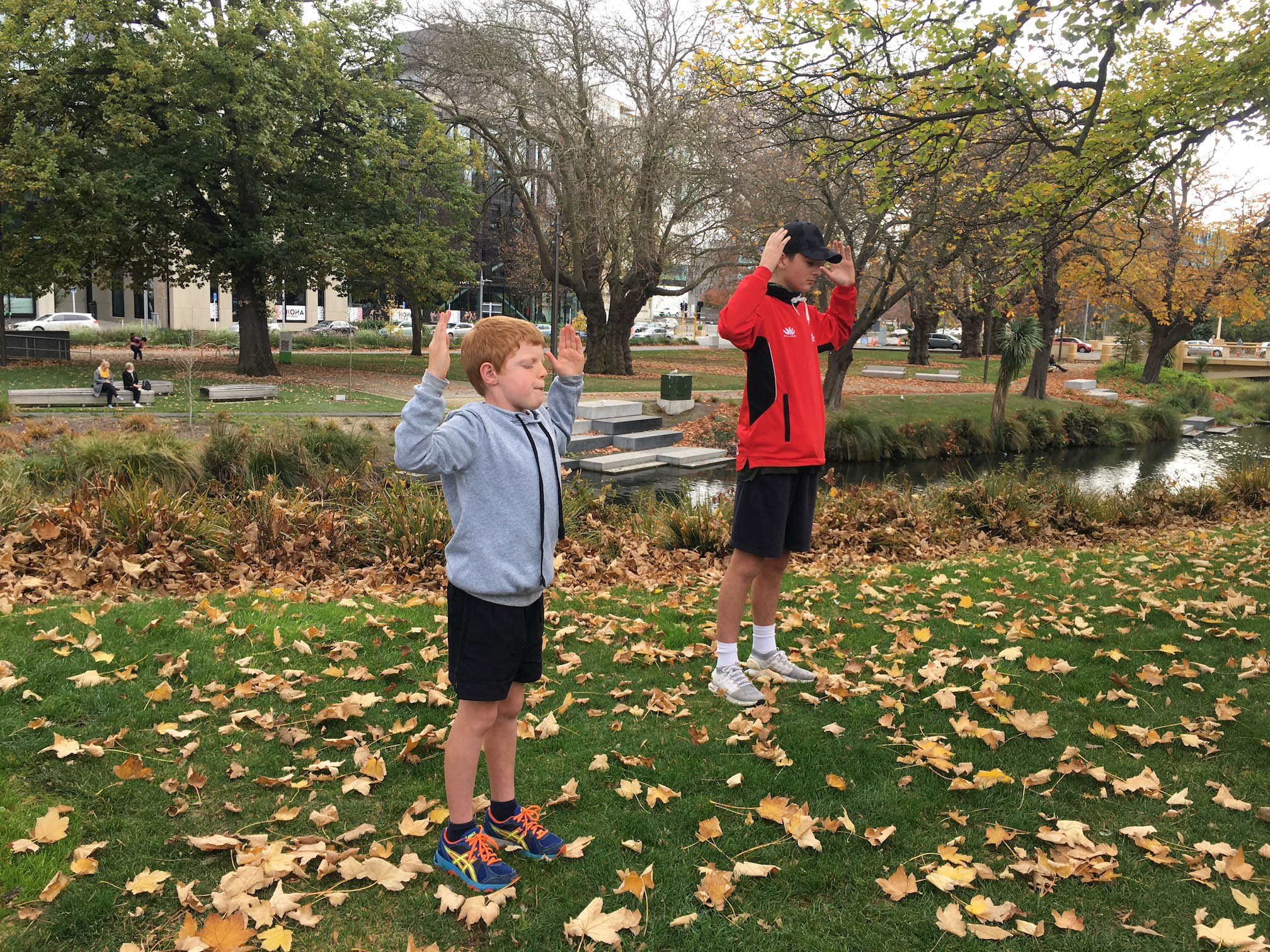 路人尼科(Nico)兄弟俩征求学员同意,进入场地学习炼功。这时,一旁缓慢行驶的观光电车里,一位乘客举起双手,模仿着学员“头顶抱轮”的动作,还有的人对着学员竖起拇指称赞。