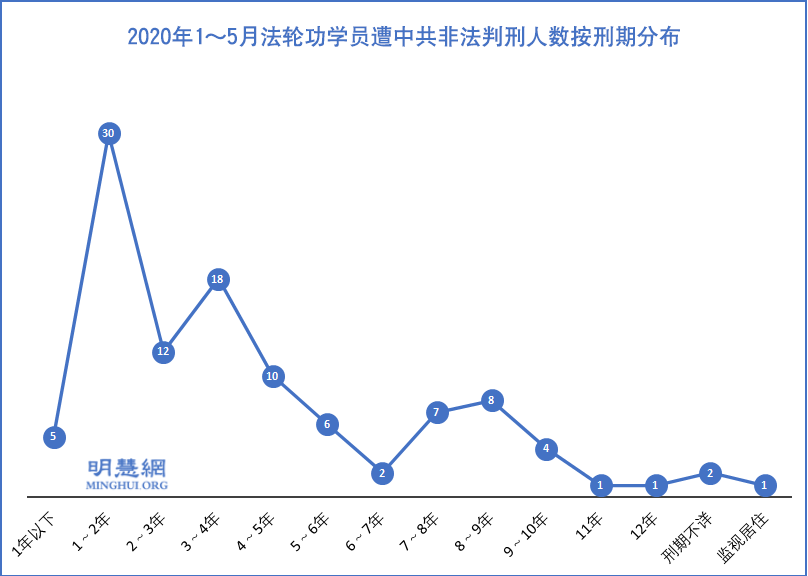 据明慧网信息统计,二零二零年五月份,中共法庭非法冤判法轮功学员12人。最高刑期12年。