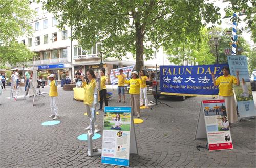 法轮功学员在慕尼黑居民区红十字广场(Rotkreuzplatz)举办活动,在“法轮大法好”的横幅前,人们观看法轮功学员展示功法,阅读展板并跟学员交谈。展位刚刚摆放之际,就有民众过来签名,声援法轮功学员反迫害。