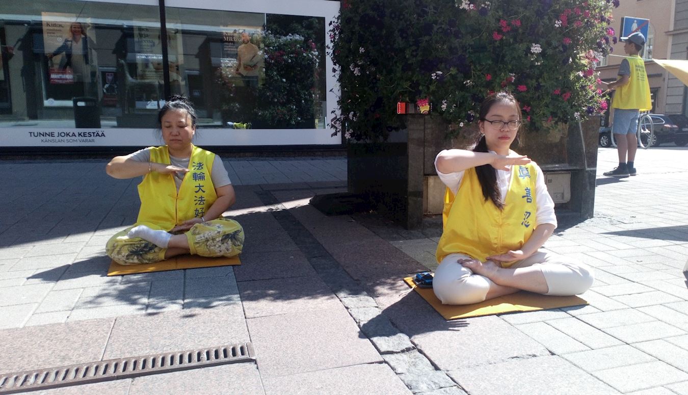 ![]() 图1:芬兰法轮功学员在繁华的步行街上炼第五套功法。 |