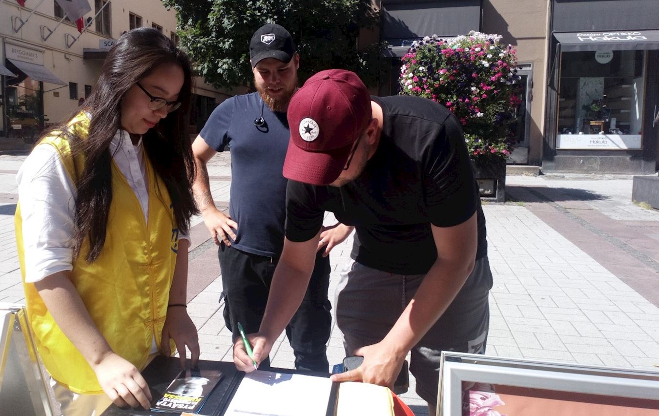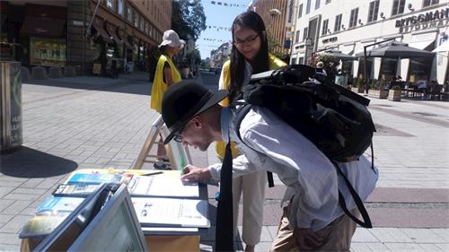 年轻小伙子友希(Jussi)告诉学员,几年前在深圳出差期间,他和他的同事工作签证被无端取消。“在中国社交媒体都不可以使用,不能触及任何敏感话题。刚开始不知道你们在做什么。后来看到你们穿的黄色衣服上写着法轮大法,才知道是法轮功。所以我要来签名支持你们。”