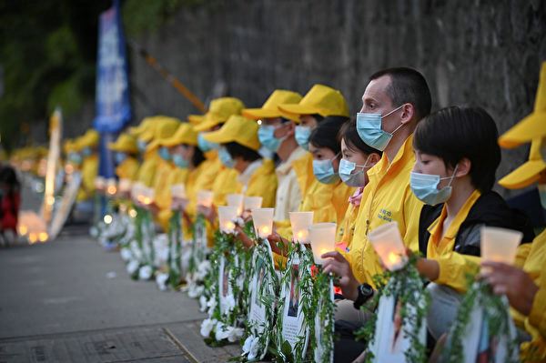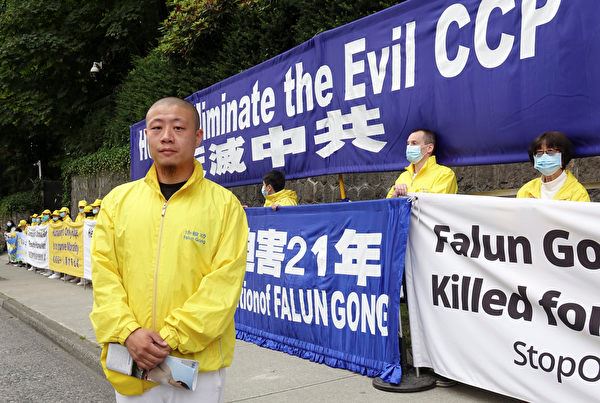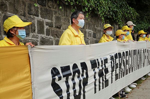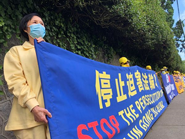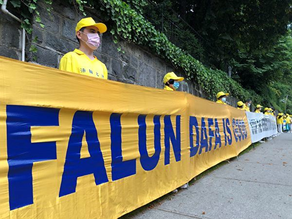 身穿黄色风衣的法轮功学员在中领馆大门两侧,展示“天灭中共”、“法轮功反迫害21年”等各式中英文横幅,排出了长达一百多米的真相长城,呼吁各界正义力量共同制止中共迫害法轮功。