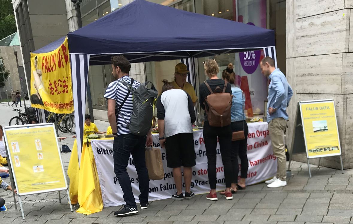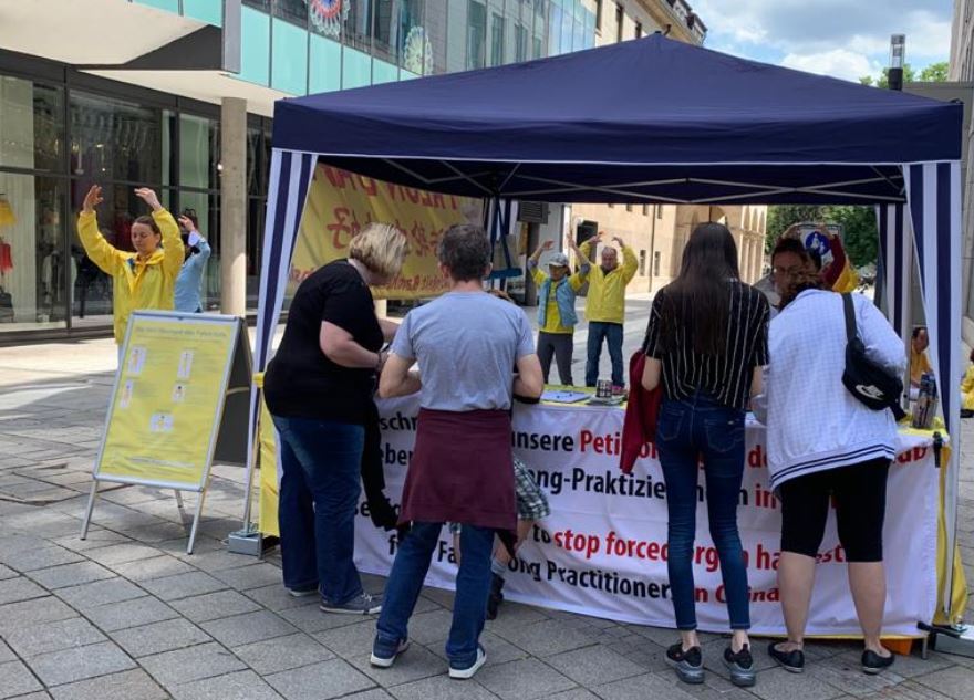 法轮功学员们展示功法时,祥和的能量场总能吸引很多路人驻足观看。一位中年女士带着女儿来到信息台前,她表示自己经常去中国,但以前没听说过法轮功和活摘器官。学员告诉她,中共对被关押的法轮功学员体检,并建立了一个数据库,按需摘取他们的器官卖钱。她忙问:“我怎么做可以帮助你们?”学员告诉她,可以在反对中共活摘器官的签名表上签名,她毫不犹豫地签了名,并拿了传单。