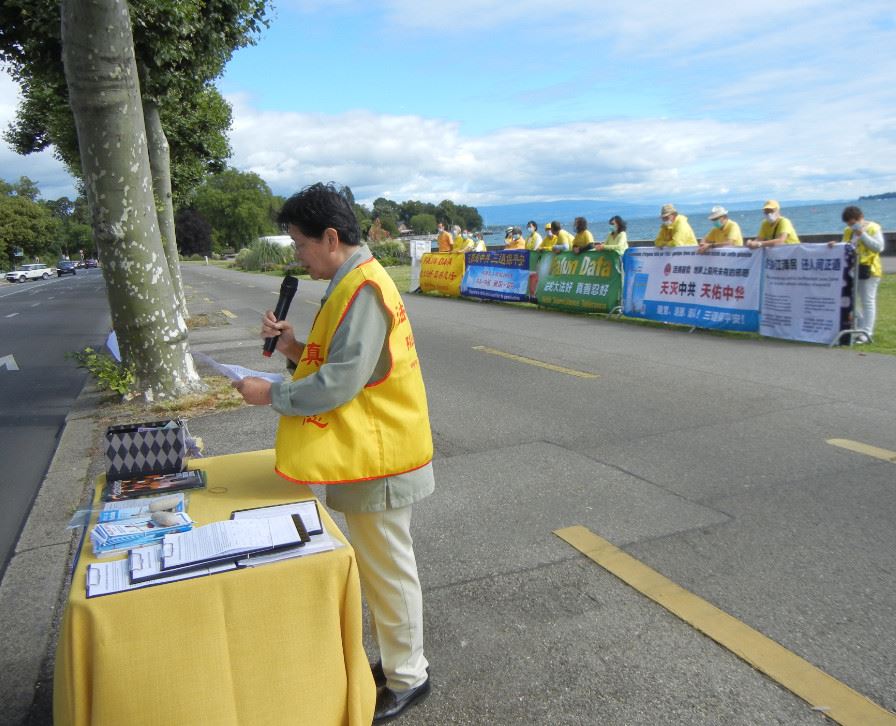 法轮功学员代表在发言中说:“我们今天在这里集会,因为今年是法轮功修炼者以无限的勇气、和平抵制中国共产党凶残迫害法轮功二十一周年。我们今天在这里,请求瑞士当局和联合国人权事务高级专员,请他们要求中国(中共)政府,停止在中国的这一残酷迫害,因为这是违反了中国已签署的联合国关于公民基本民事和政治权利的《国际人权公约》的行为。”