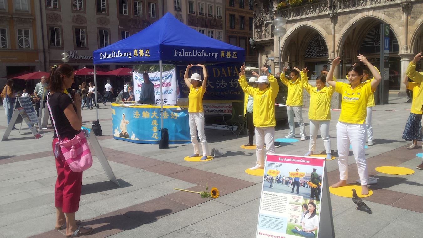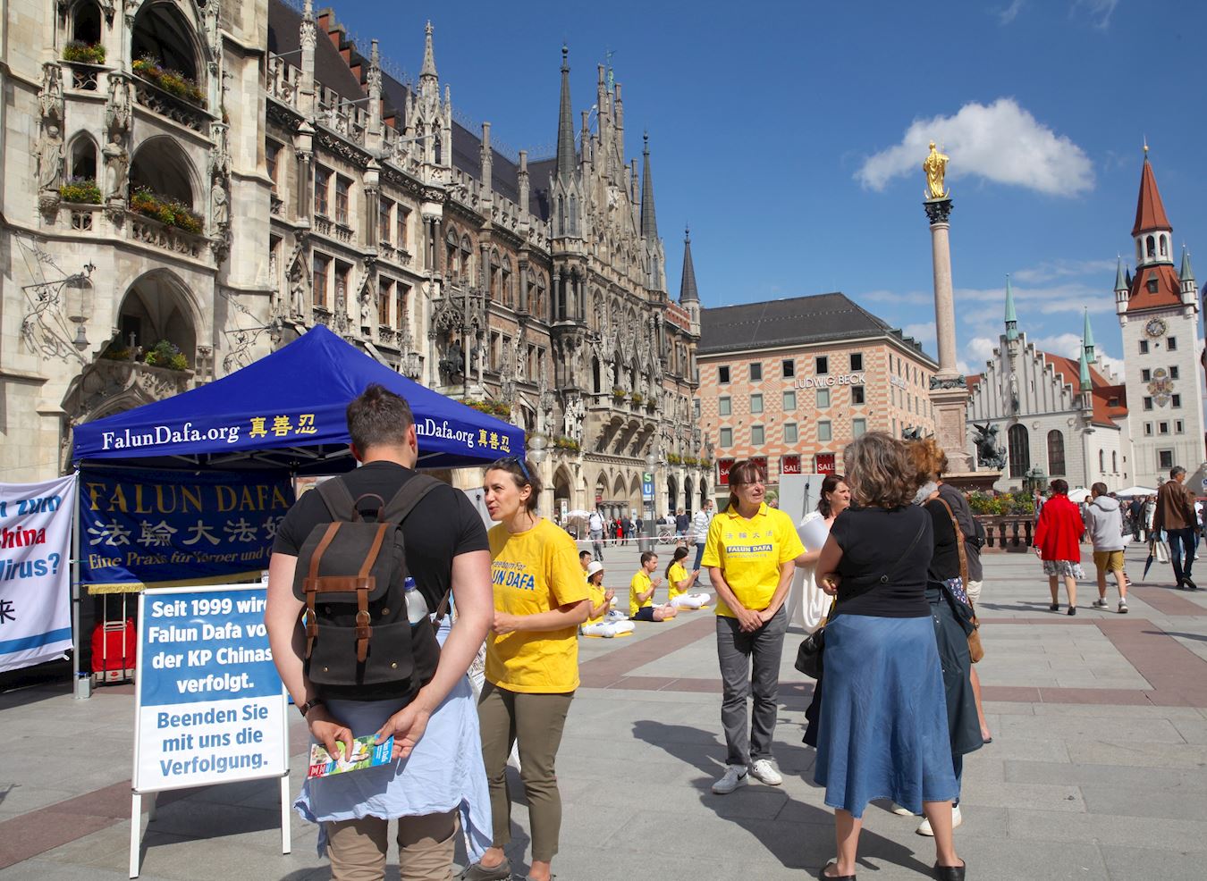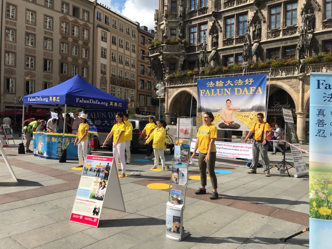 二零二零年七月十七日,法轮功学员在德国慕尼黑的玛琳广场(Marienplatz)举办反迫害二十一周年的活动,向过往的民众讲述法轮功的真相。“法轮大法好”和揭露中共活体摘取法轮功学员器官的巨型横幅十分醒目,在祥和的音乐伴随下,身穿黄色上衣的法轮功学员向人们展示法轮功功法。很多人驻足观看并跟法轮功学员交谈,人们无法理解为什么这么和平的功法会遭受中共长达二十一年的残酷迫害。