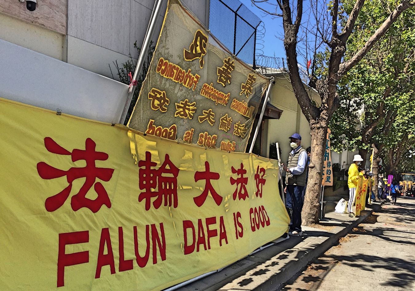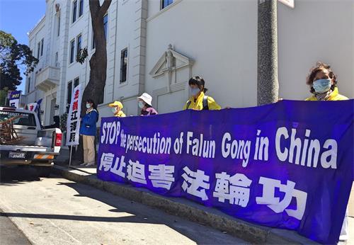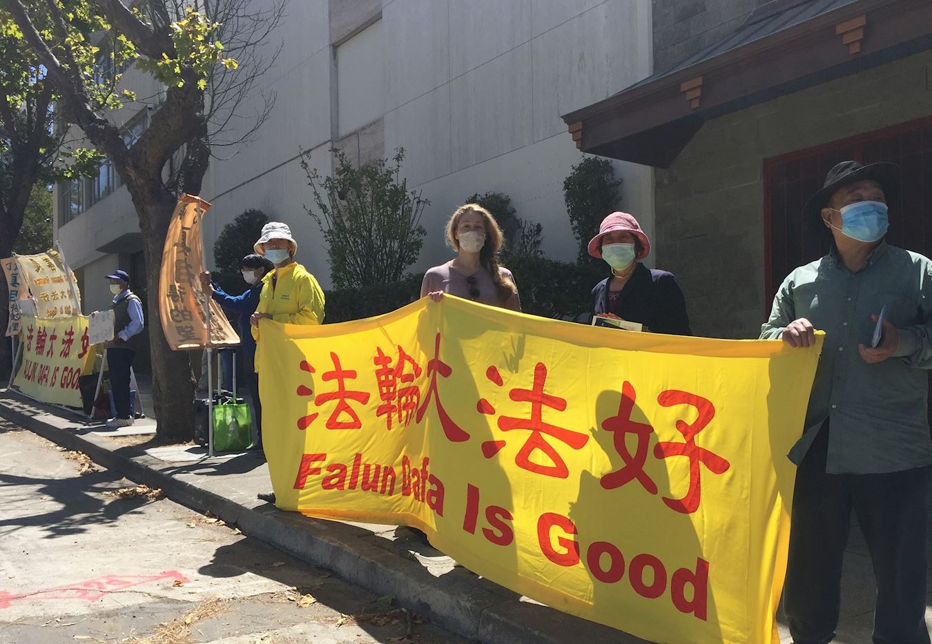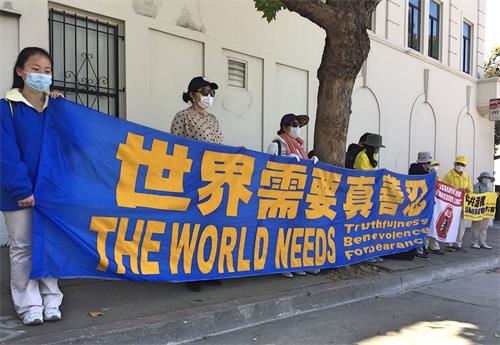 七月十七日当天上午,大约一百位旧金山的法轮功学员陆续来到中领馆前,打出“法轮大法好”、“世界需要真善忍”、“停止迫害法轮功”、“法办江泽民”、“制止中共活摘法轮功学员器官”、“天灭中共 退!党!自救”等横幅。学员们按照政府戴口罩、保持社交距离等规定,在祥和的音乐中,静静的发出,呼唤世人快找真相,认知中共邪恶,解体中共,共同制止迫害的心声。