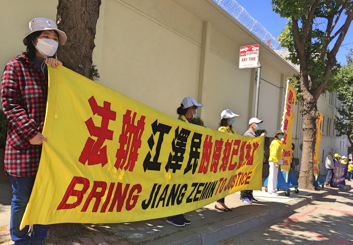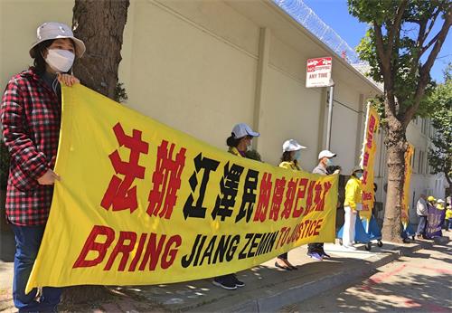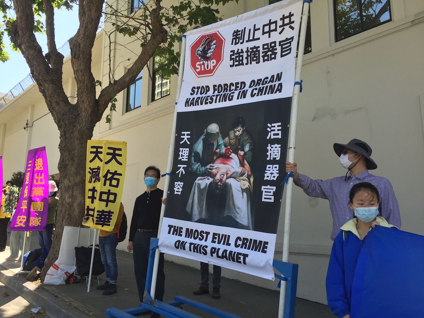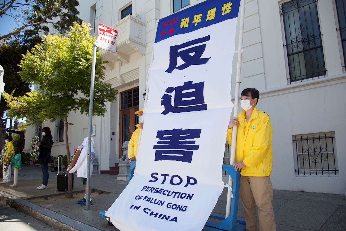七月十七日当天上午,大约一百位旧金山的法轮功学员陆续来到中领馆前,打出“法轮大法好”、“世界需要真善忍”、“停止迫害法轮功”、“法办江泽民”、“制止中共活摘法轮功学员器官”、“天灭中共 退!党!自救”等横幅。学员们按照政府戴口罩、保持社交距离等规定,在祥和的音乐中,静静的发出,呼唤世人快找真相,认知中共邪恶,解体中共,共同制止迫害的心声。