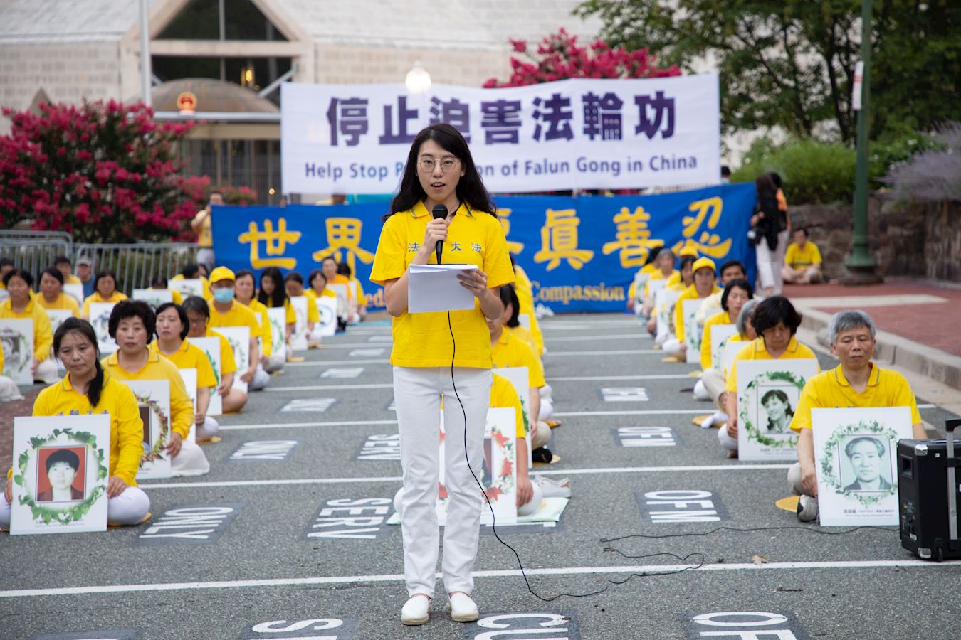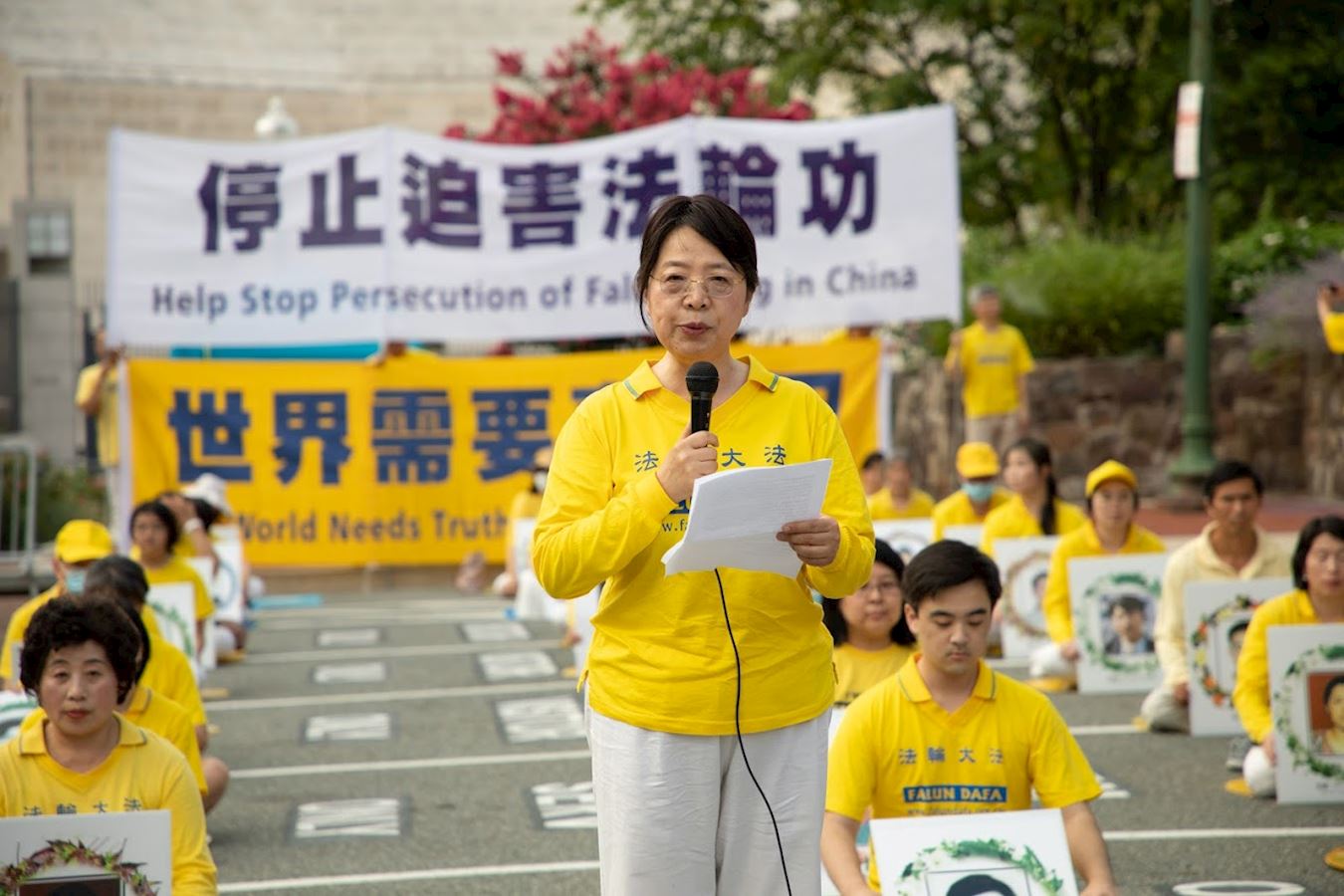 图9:华盛顿DC法轮大法学会发言人葛敏在集会上呼吁良知尚存的人们远离中共,与善良同行。
