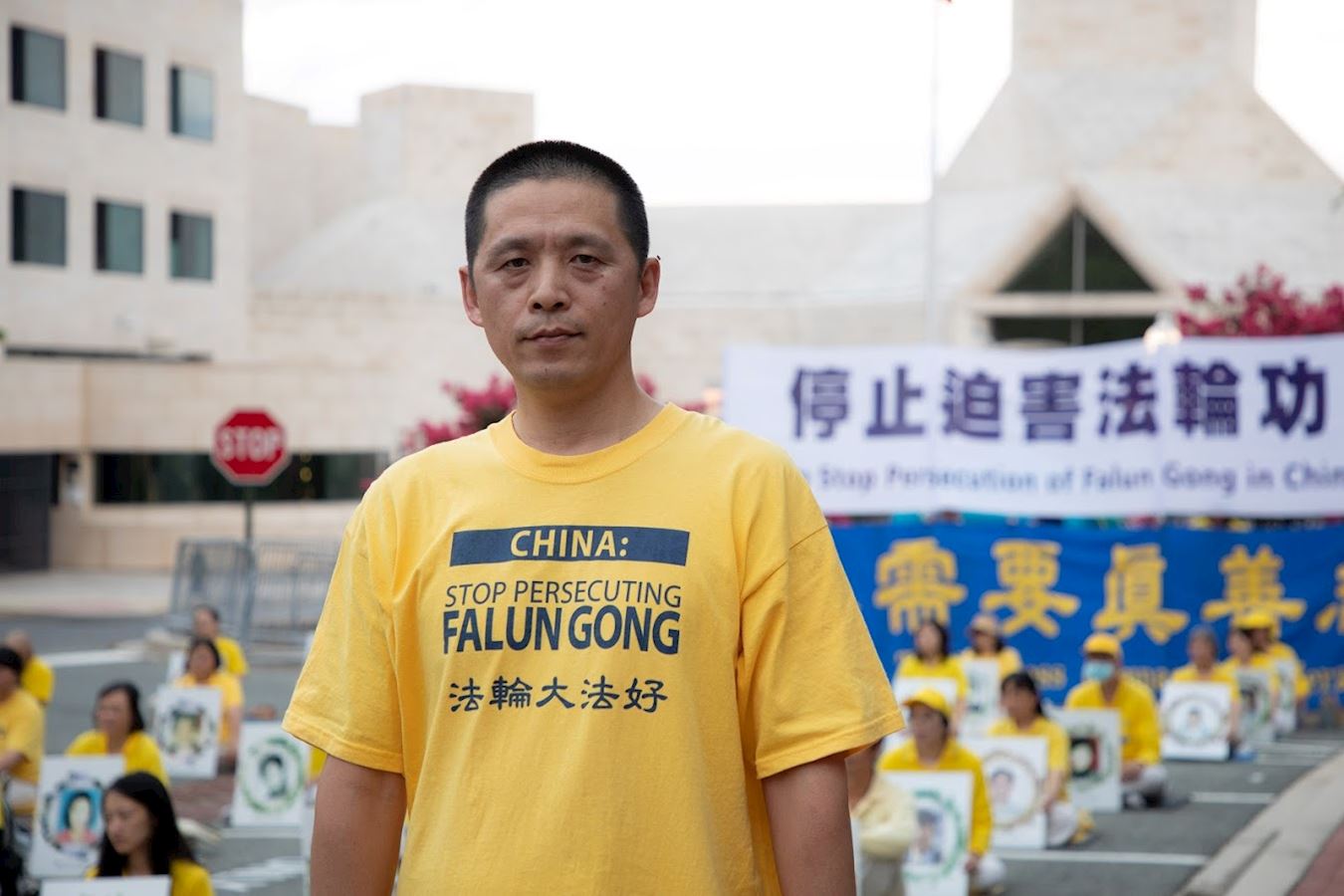 图8:二零二零年七月十七日,来自吉林的建筑师赵庆凯参加在中共驻美大使馆前的集会。