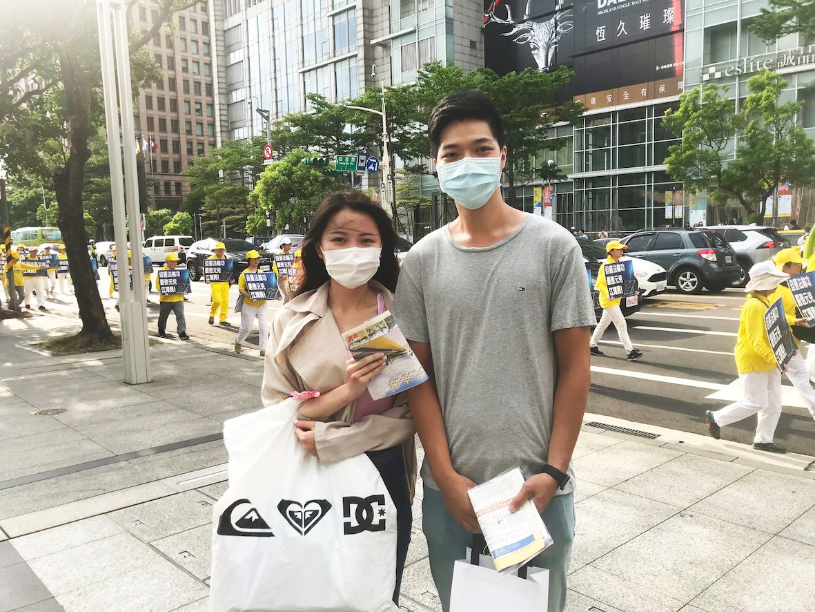 从事科技业,二十六岁的林先生,特别从新北市到信义区逛街,并与法轮功学员的游行队伍巧遇。他看到“天国乐团”的乐器让人惊艳,他赞叹说:“这是国家级游行才会有的隆重感。”他也收到学员递送的真相资料,而林先生也感叹,“因为台湾疫情控制得不错,让大家可以出来游行,这是很好的。”