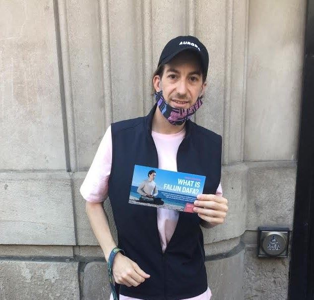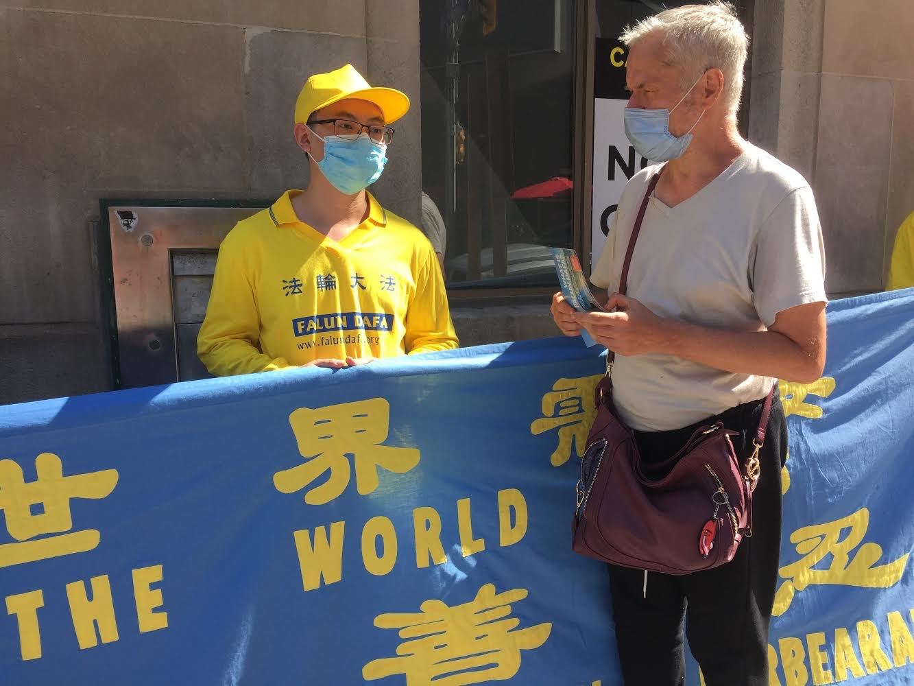 在多伦多市中心,路人克里斯(Chris)欣然的接过了学员递给他的大法真相资料,他说自己之前了解过法轮功:“在学校里我有一个朋友,她不是法轮功修炼者,但她录制了一个视频,就是讲述法轮功以及法轮功修炼者的。而且这个视频在制作出来后,还被上传到了CBC.早晨我在公园经常可以看到法轮功修炼者在伴随着音乐炼功。”他还一边做着炼功的动作。