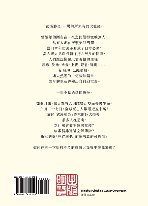 武汉肺炎,一场前所未有的大瘟疫。一场不见硝烟的战争。截止到二零二零年七月十九日,全球因武汉肺炎而死亡的人数已超过六十万人,而实际感染这波新型冠状病毒的人数远不止于此。面对瘟疫造成的巨大损失,很多人在思考:为什么会发生这场瘟疫? 新冠病毒是天然还是人造?通过什么渠道传染? 到底有多么危险?如何防护?