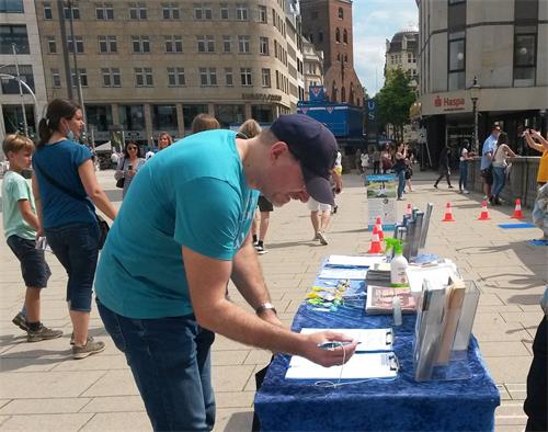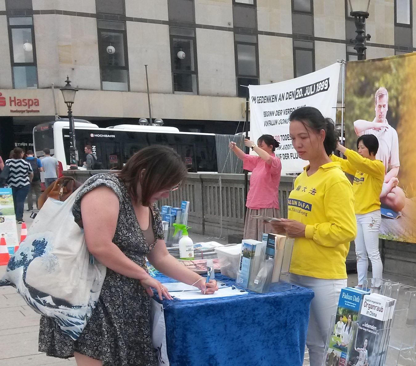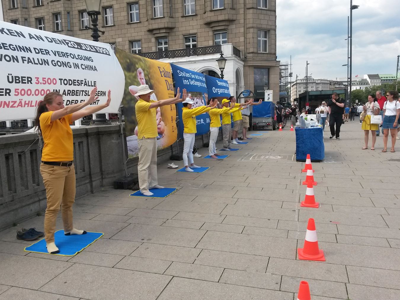 当天下午,法轮功学员们在汉堡市中心繁华的处女堤(Junfernstieg)里斯坝桥(Reesendammbruecke)上搭起信息台与大型展板,向来往行人介绍佛家修炼大法—法轮大法。部份学员演示法轮功的五套功法,其余的学员则向过往行人递上真相传单,为感兴趣的民众讲述仍在中国持续着的迫害,特别是中共活体摘取法轮功学员器官以获取暴利的恶行。了解真相的民众纷纷在呼吁制止迫害的征签表上郑重签名,以表达对法轮功学员的支持。