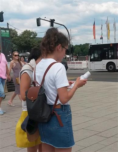 一位中年女士阅读了真相展板后,对法轮功学员表示,她曾听说过这场迫害,2009年她去中国旅游时,曾向导游问起过法轮大法和中共的迫害,导游当时立即闭口不说话了,也没再提起这个话题。学员告诉她,对这类话题,中国人都被噤声了,因为害怕同样遭受中共迫害,他们什么都不敢说。