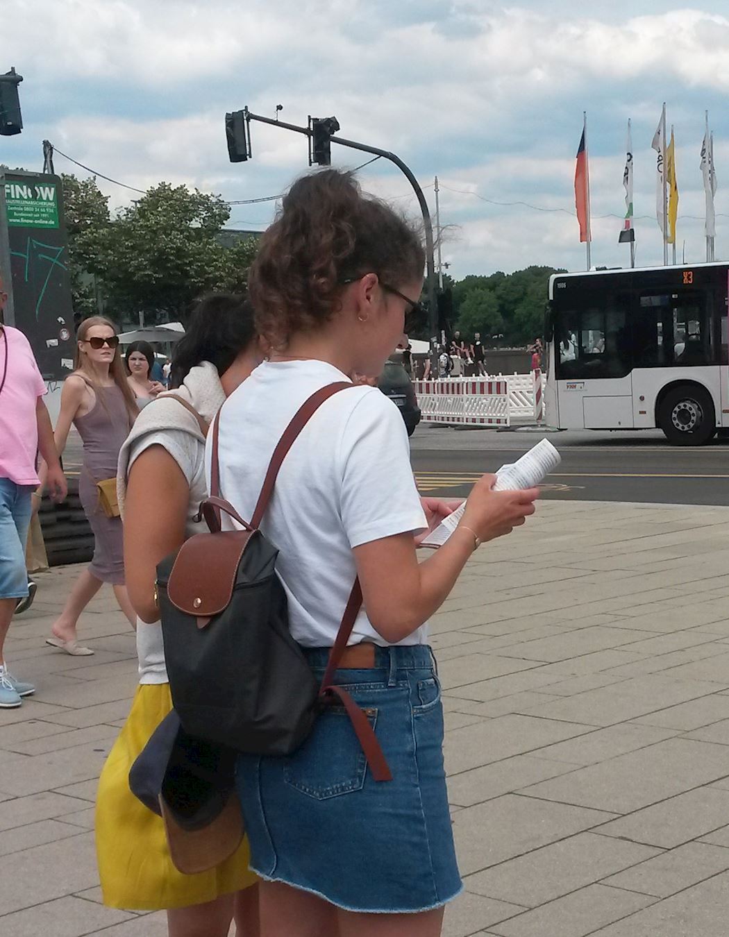 一位五十岁出头的女士在信息台前停下自行车,向法轮功学员详细了解了在中国发生的强摘器官恶行。她表示自己曾对此有所耳闻,并多次看到过法轮功学员在中共驻汉堡领事馆前的请愿活动与真相展板,她还曾经签名支持制止迫害。