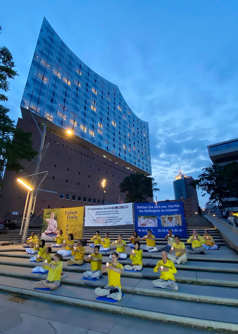 当天晚间21点至22点,法轮功学员来到汉堡易北爱乐厅(Elbphilharmonie)前举办烛光悼念,悼念过去二十一年里,在中国大陆被迫害致死的法轮功学员们。