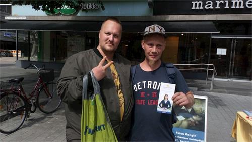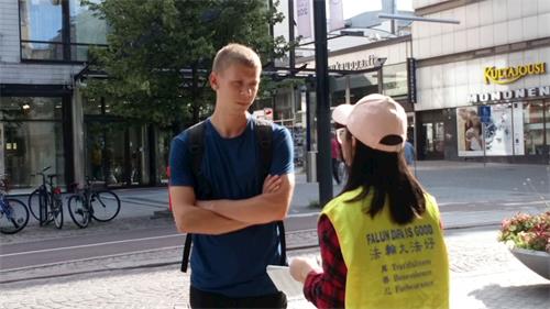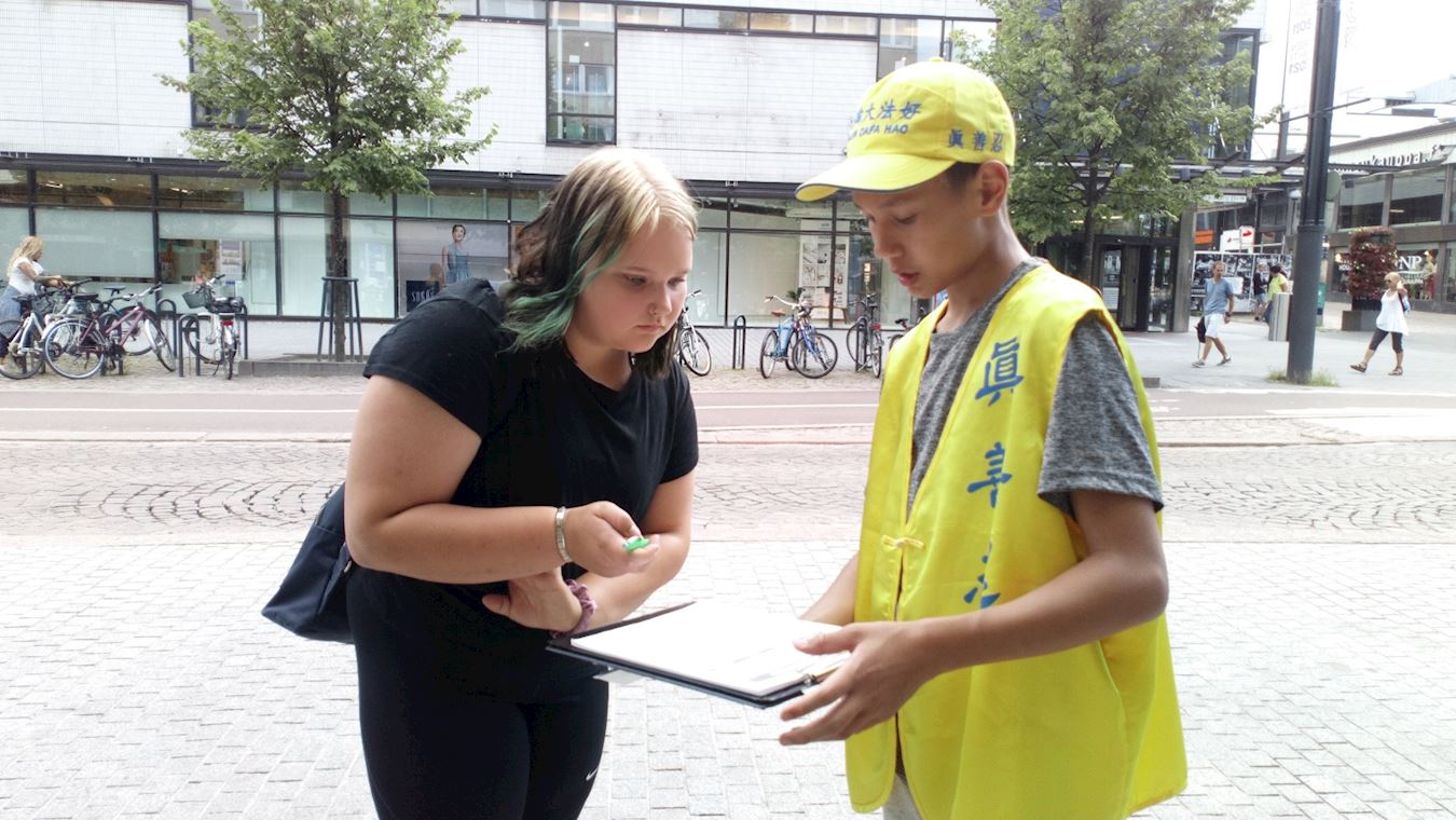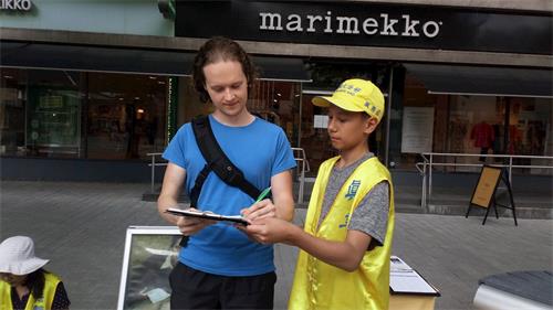 米科(Mikko)路过展桌拿了真相资料,不一会儿又回来了,原来他从资料上找到法轮功学员的网站后浏览了更多信息,马上过来想签名。他说:“我是学地质学的,所以对世界各地的人文地理都想多了解。在中国,中共迫害西藏人、维吾尔族人,现在香港的情况也非常不好。我们要更加的关注。”